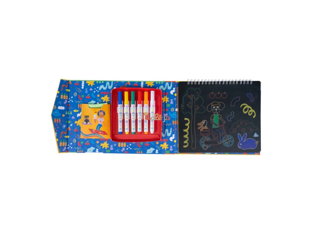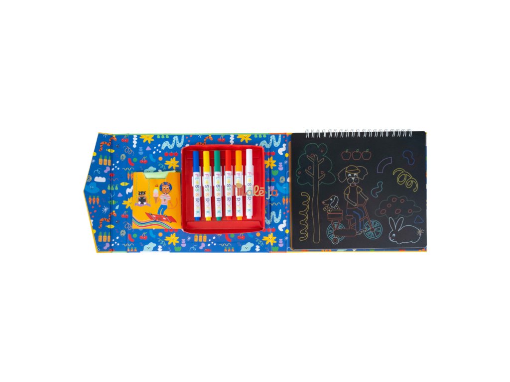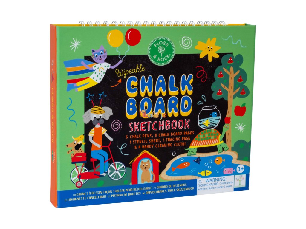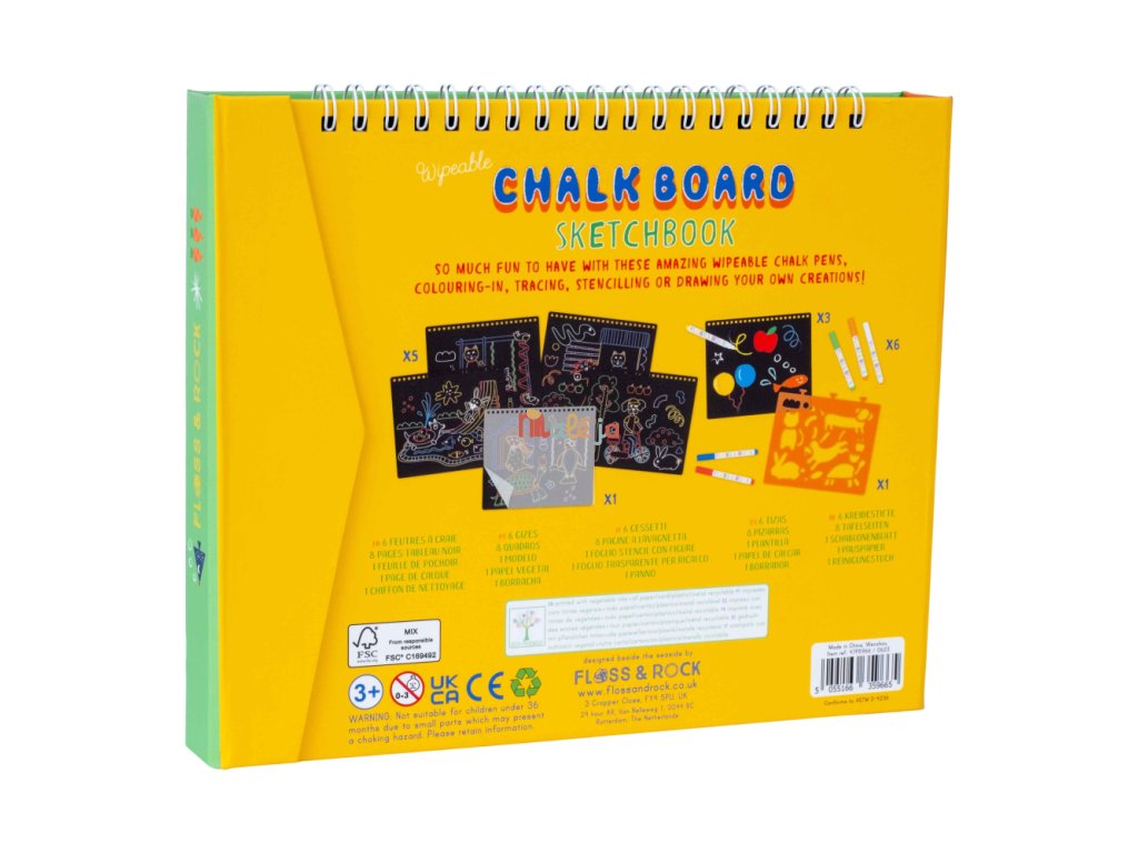 Skicár s tabuľkou a kriedou obsahuje 8 strán. 5 strán s ilustráciami pripravenými na vyfarbenie, plus 3 obyčajné strany pripravené na kreslenie vo voľnom štýle! K dispozícii je tiež obkresľovací hárok a hárok s motívom. Obidva tieto listy možno odstrániť a pripnúť do špirálovej knižnej väzby, kdekoľvek si vyberiete! Skicár je dodávaný so 6 farebnými kriedovými perami a praktickou čistiacou handričkou na utretie stránok, keď skončíte, pripravený začať znova a nabudúce pokračovať vo svojej kreativite! Stránky sú vytlačené rastlinnými atramentmi a všetok obsah papiera, kartónu, plastov a kovu je recyklovateľný.