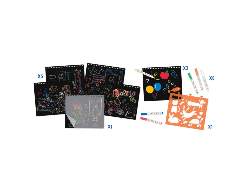 VLASTNOSTI 8 strán plus odnímateľný kresliaci a hárok so šablónou 6 kriedových pier + šikovná čistiaca handrička
