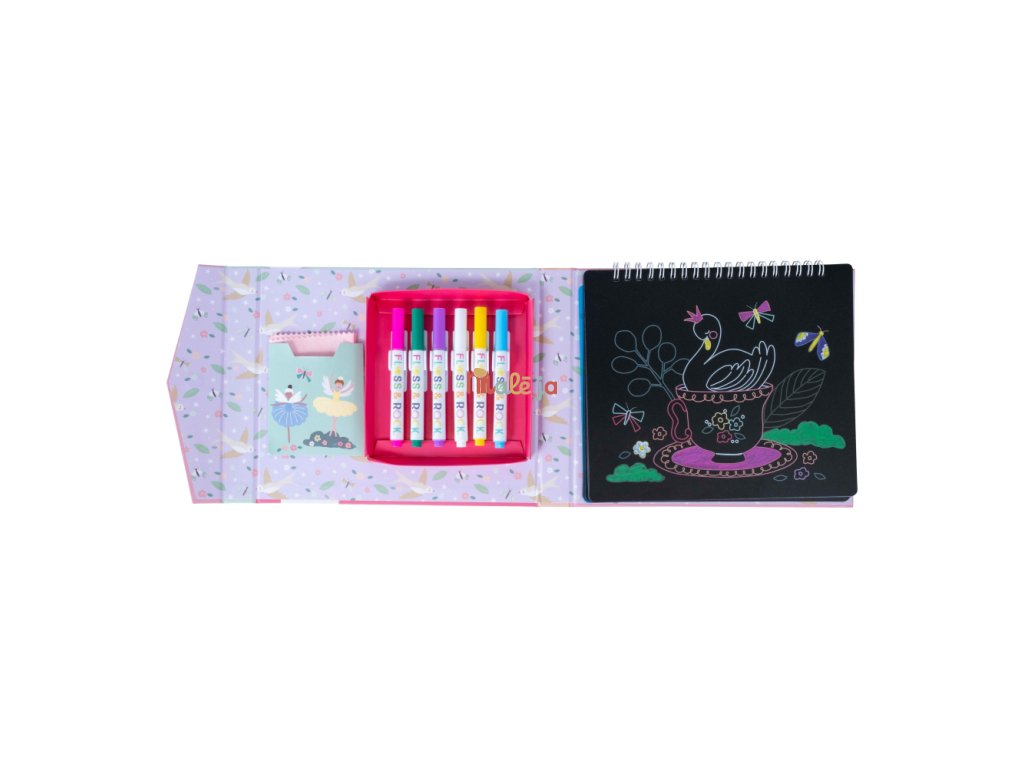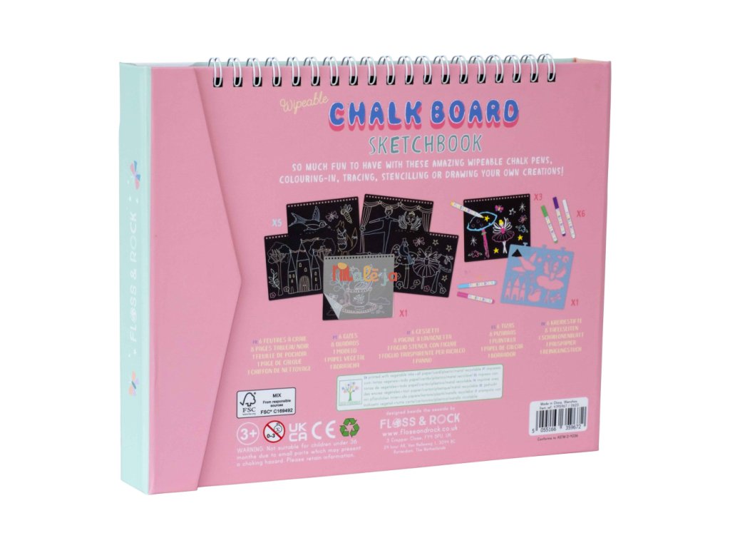 Skicár s tabuľkou a kriedou obsahuje 8 strán. 5 strán s ilustráciami pripravenými na vyfarbenie, plus 3 obyčajné strany pripravené na kreslenie vo voľnom štýle! K dispozícii je tiež obkresľovací hárok a hárok s motívom. Obidva tieto listy možno odstrániť a pripnúť do špirálovej knižnej väzby, kdekoľvek si vyberiete! Skicár je dodávaný so 6 farebnými kriedovými perami a praktickou čistiacou handričkou na utretie stránok, keď skončíte, pripravený začať znova a nabudúce pokračovať vo svojej kreativite! Stránky sú vytlačené rastlinnými atramentmi a všetok obsah papiera, kartónu, plastov a kovu je recyklovateľný.