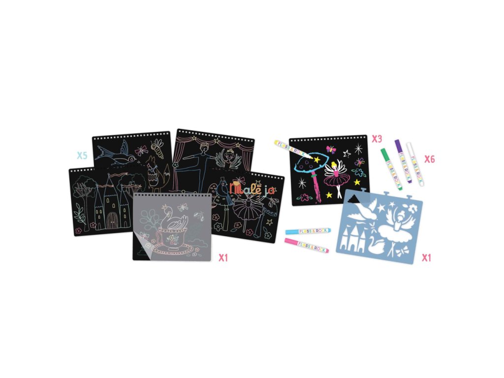 VLASTNOSTI 8 strán plus odnímateľný kresliaci a hárok so šablónou 6 kriedových pier + šikovná čistiaca handrička