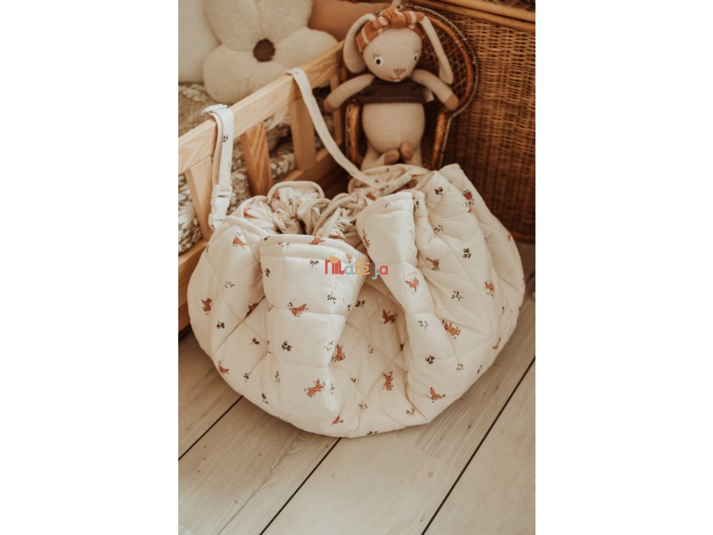 Jedinečná čalúnená detská hracia podložka, ktorá je zároveň úložným vakom na hračky a vreckom na plienky.