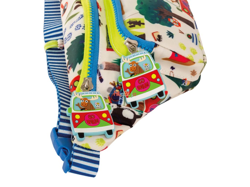 Predné vrecko so zipsom, vnútri našitý štítok „Patrím ...“ ,nastaviteľný popruh.