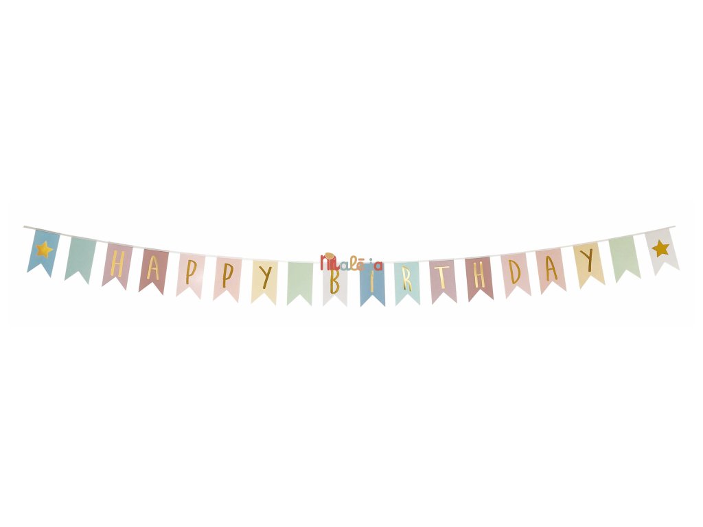 Čas na párty! Farebná vlajka Jabadabado s textom "Happy birthday" je dokonalou ozdobou každej narodeninovej oslavy. Slávnostná a zábavná dekorácia. Zadná strana vlajočky je bez textu a môže slúžiť ako dekorácia na iné párty.