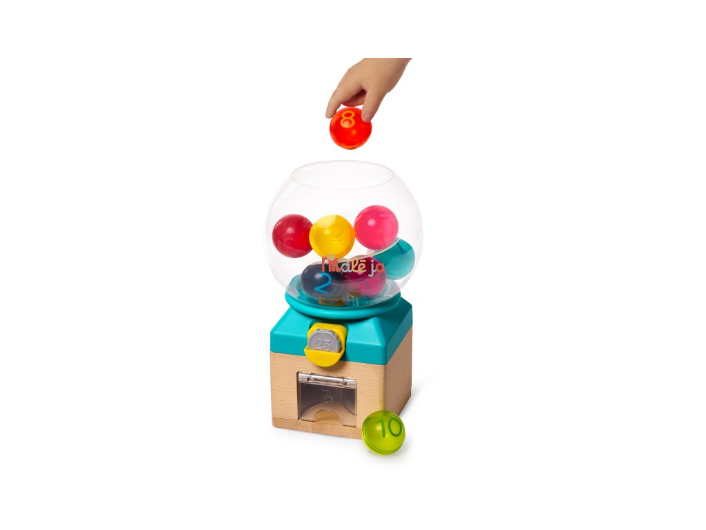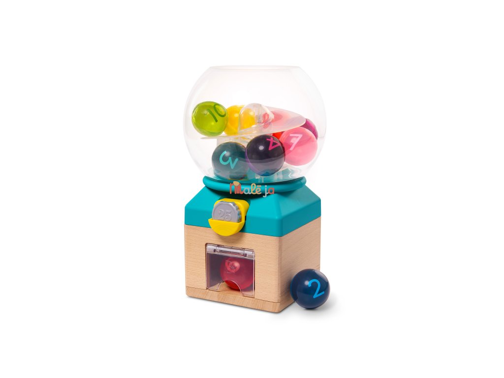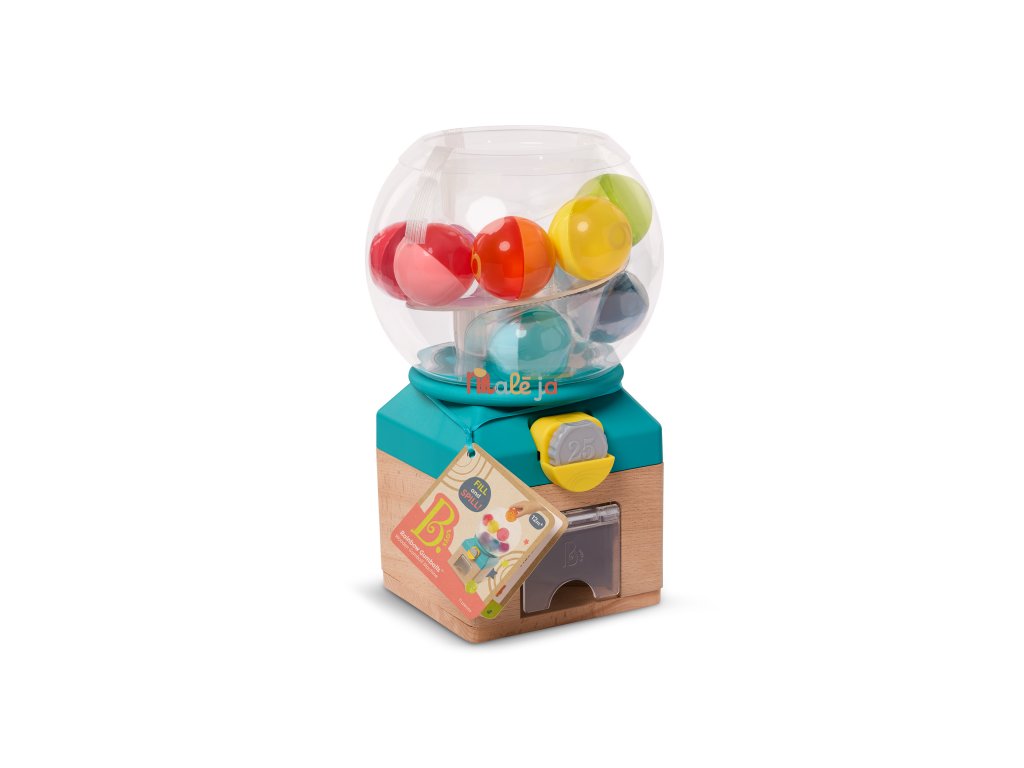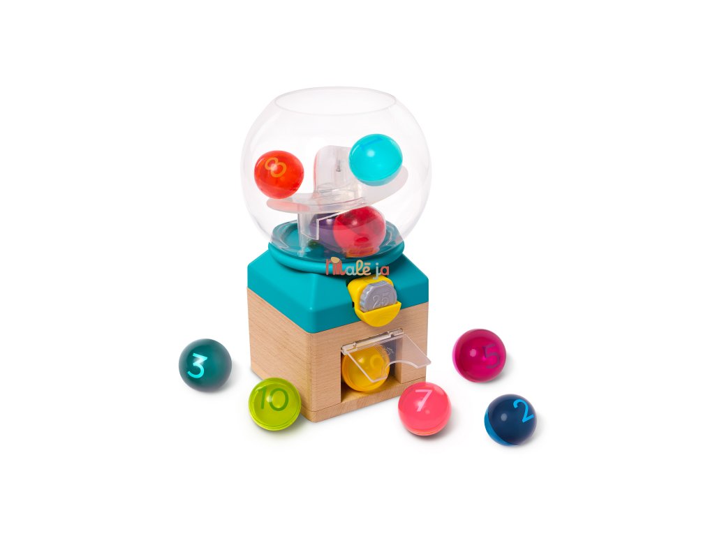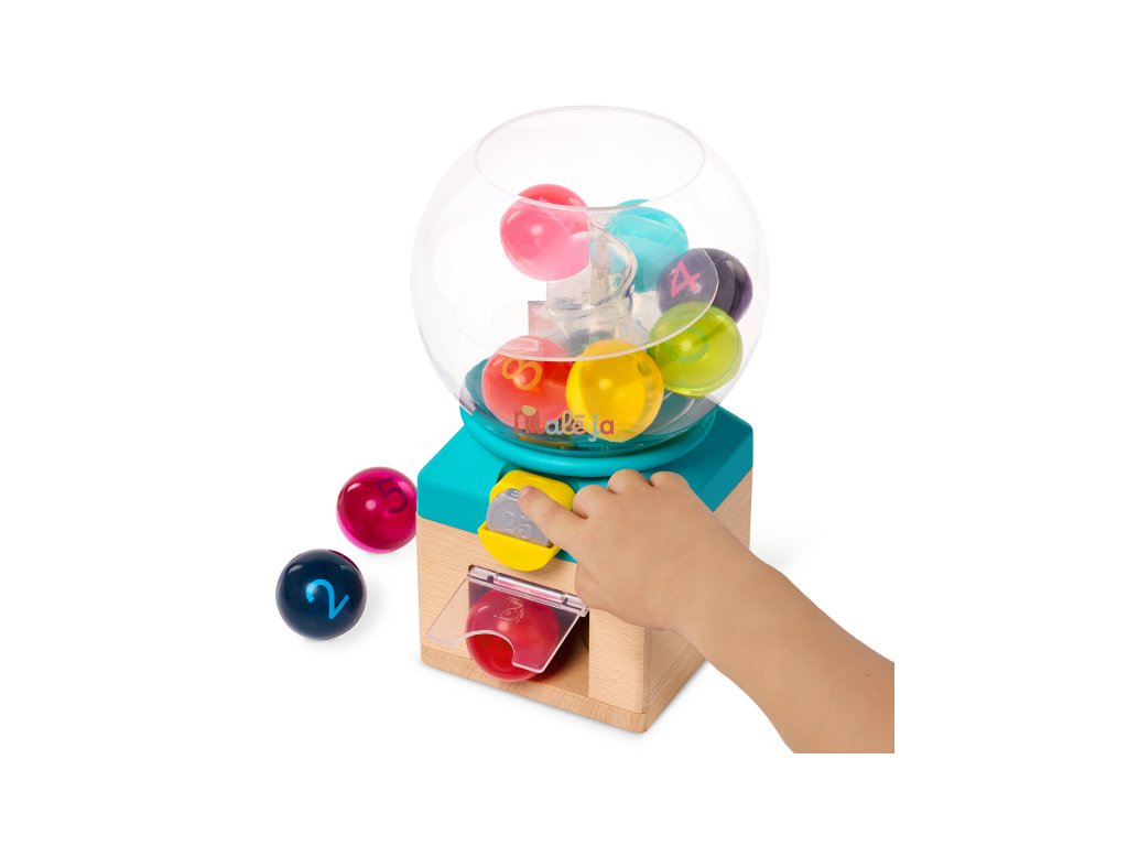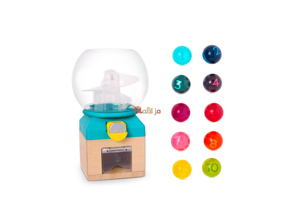 Zábava, farby a učenie v jednom! Štýlový retro automat na „žuvačky“ od B. Toys premení každé hranie v dobrodružstve s číslami. Naplňte priehľadnú guľu 10 farebnými loptičkami a stlačte mincu – prekvapenie je na svete! Deti budú nadšene sledovať, ako loptičky vychádzajú von po točitej rampe, a pri tom sa naučia spoznávať farby aj čísla od 1 do 10. Pevná drevená základňa zaisťuje stabilitu a elegantný vzhľad - hračka je tak aj krásnym doplnkom detskej izby. • Obsahuje 10 farebných loptičiek s číslami a základňu s mincou • Stlačením mince sa uvoľní loptička a deti hádajú, aké číslo vyjde • Podporuje hrubú motoriku, koordináciu oko-ruka, poznávanie farieb a čísel Rozmery: 15,3 × 16,3 × 26,4 cm Vhodné pre deti od 12 mesiacov.