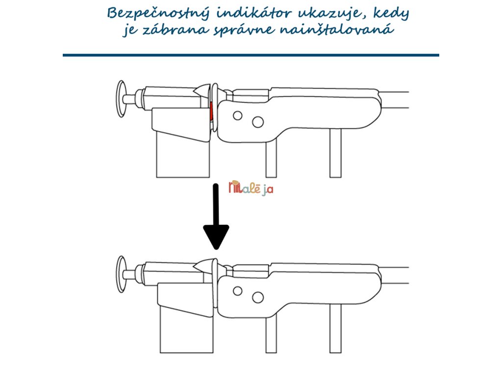 Všetky bezpečnostné tlakové zábrany Baby Dan sú vybavené bezpečnostným indikátorom, ktorý ukazuje, či bola brána správne namontovaná. Tento indikátor je ďalším bezpečnostným opatrením pre vás.