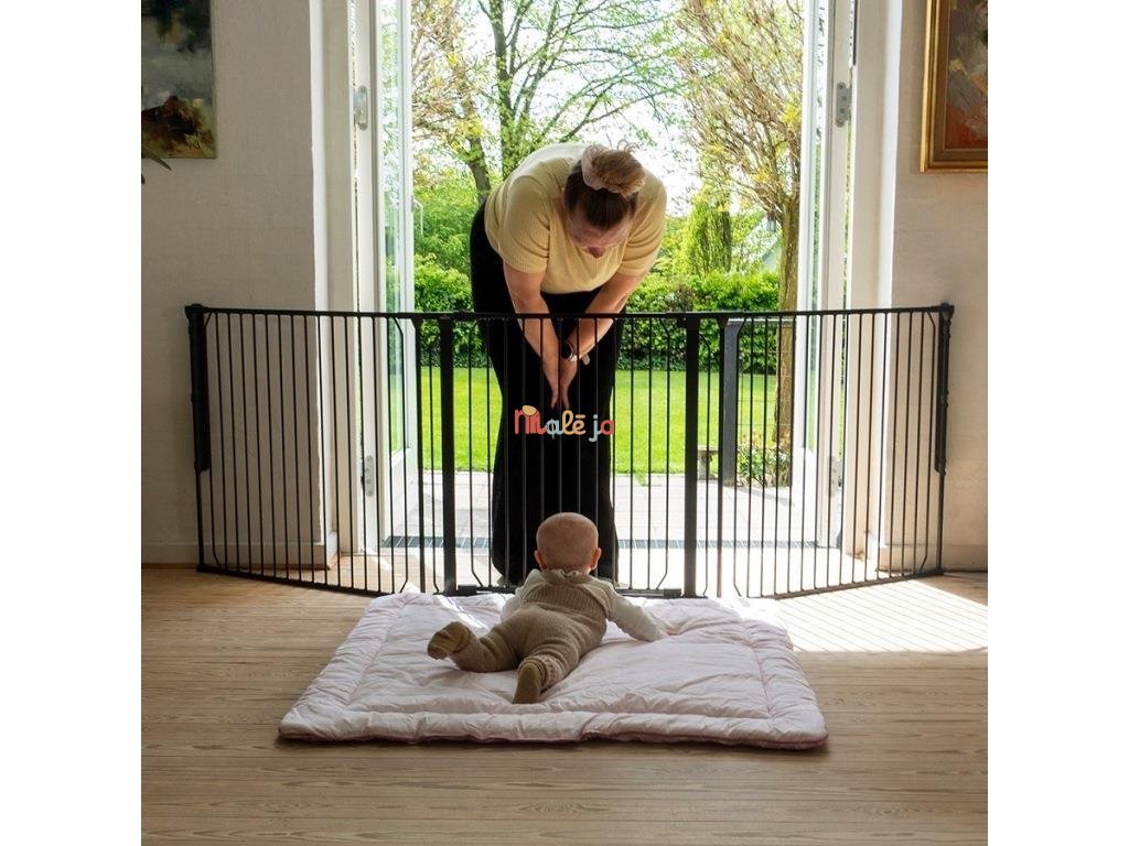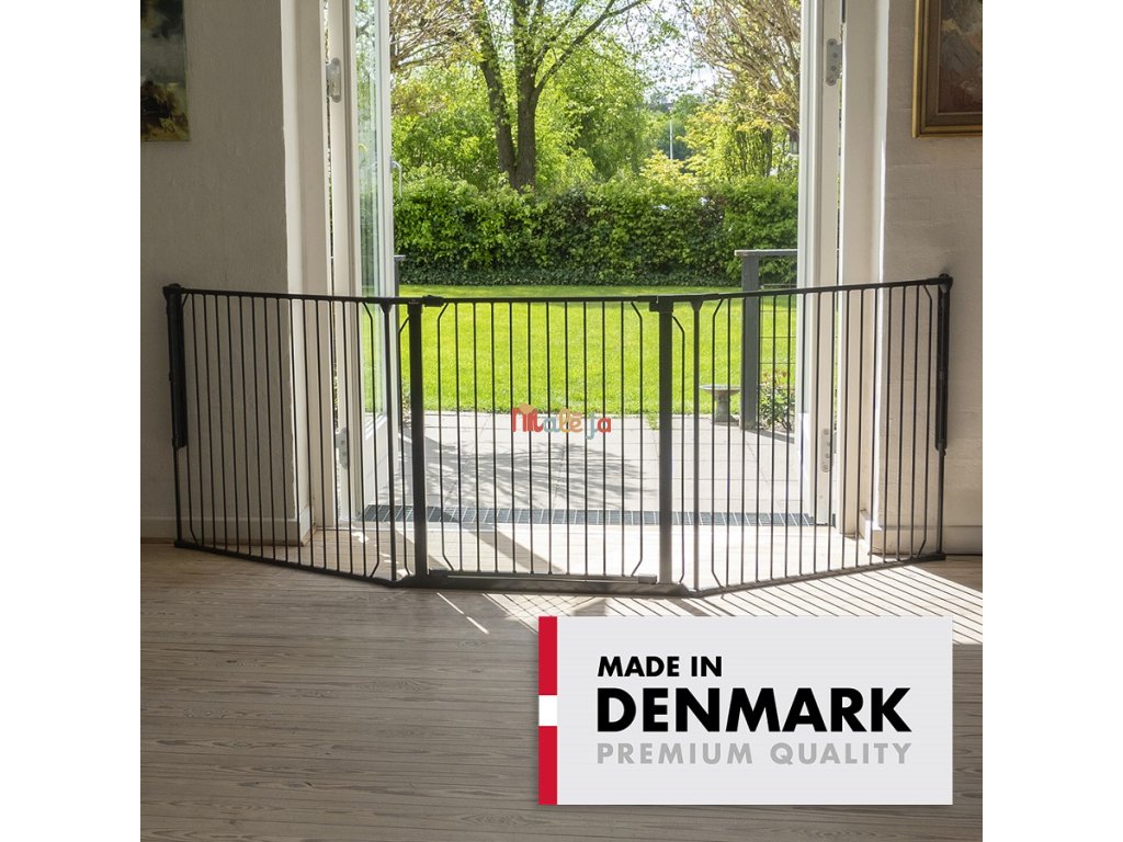 Carl X Wide je navrhnutý s ohľadom na flexibilitu. Zábranu je možné nastaviť do rôznych uhlov, aby sa prispôsobila tvaru miestnosti – či už chcete tvar polmesiaca alebo mierne zakrivenú konštrukciu. Máte voľnosť v umiestnení jednotlivých dielov tak, aby čo najlepšie vyhovovali vášmu priestoru. Zábranou môžete ľahko prejsť pomocou širokých dverí, ktoré je možné otvoriť z oboch strán jednou rukou – užitočná funkcia v uponáhľanom živote. Vďaka svojmu flexibilnému dizajnu a robustnej konštrukcii je BabyDan Carl X Wide spoľahlivým riešením na vytvorenie bezpečného prostredia vo väčších priestoroch. Možno neobmedzene predlžovať pomocou ľubovoľného počtu predĺžení (33 alebo 72 cm predĺženie sa predávajú zvlášť)