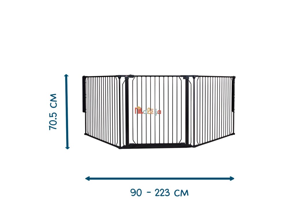 Technická špecifikácia: Výška 70,5 cm Šírka 223 cm Hĺbka 3,5 cm. Minimálna šírka otvoru 90 cm. Maximálna šírka priestoru 223 cm Materiál PE (polyetylén) a oceľ s práškovým nástrekom Farba Čierna Číslo položky: BD501510 Bezpečnostná norma EN 1930 : 2011