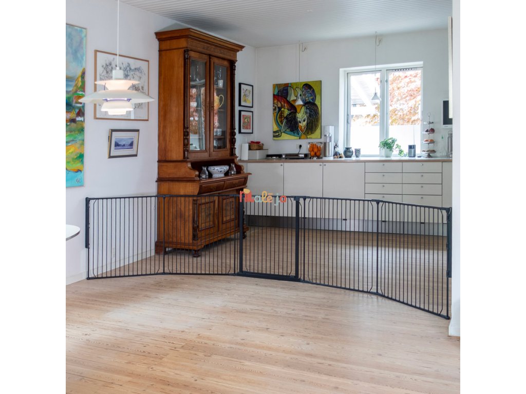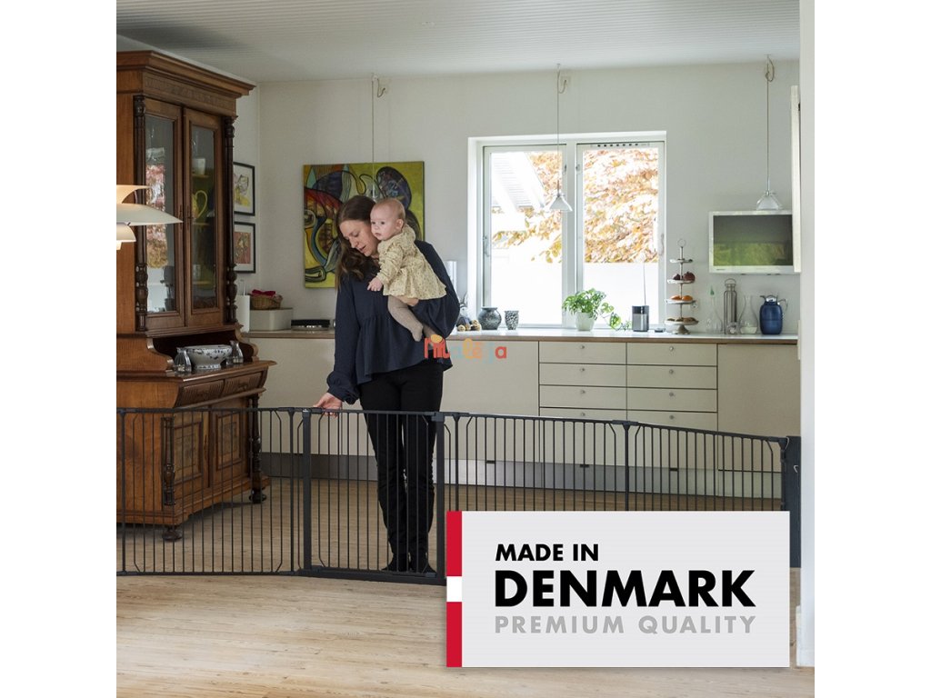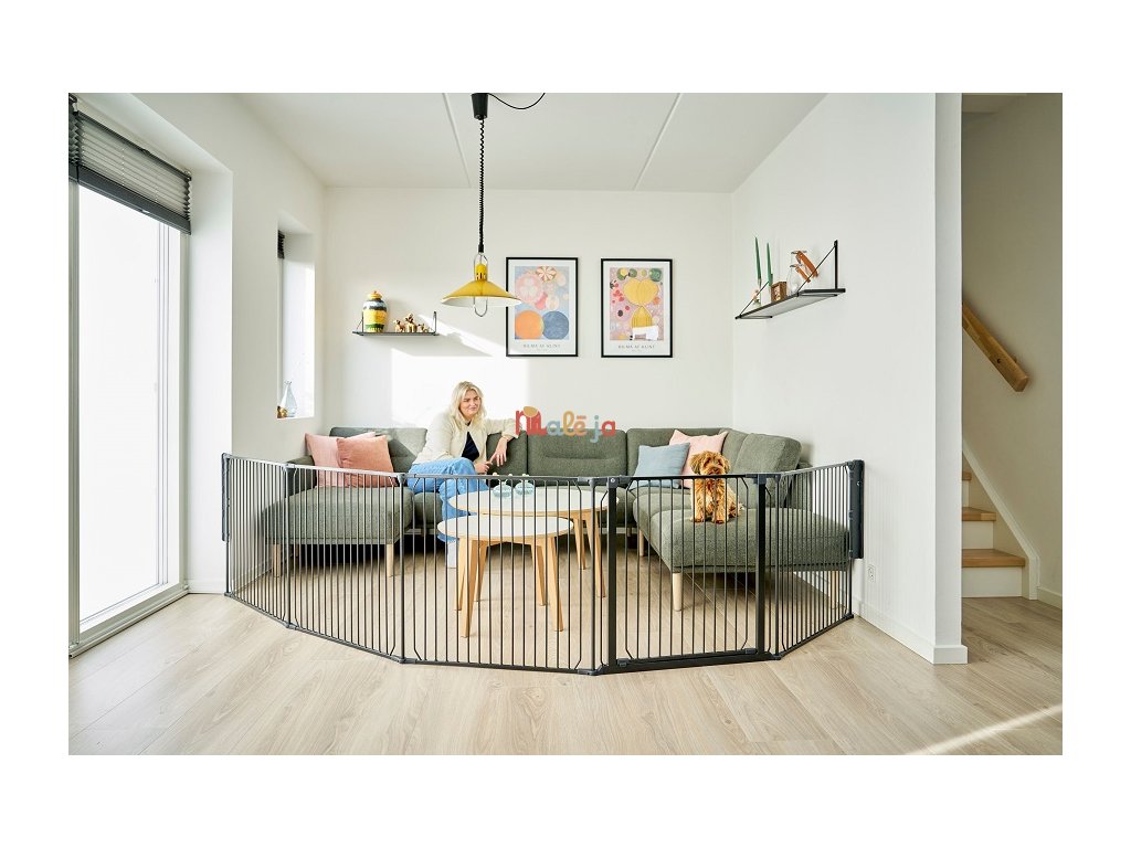Carl XXX Wide je navrhnutý s ohľadom na flexibilitu. Zábranu je možné nastaviť do rôznych uhlov, aby sa prispôsobila tvaru miestnosti – či už chcete tvar polmesiaca alebo mierne zakrivenú konštrukciu. Máte voľnosť v umiestnení jednotlivých dielov tak, aby čo najlepšie vyhovovali vášmu priestoru. Zábranou môžete ľahko prejsť pomocou širokých dverí, ktoré je možné otvoriť z oboch strán jednou rukou – užitočná funkcia v uponáhľanom živote. Vďaka svojmu flexibilnému dizajnu a robustnej konštrukcii je BabyDan Carl XXX Wide spoľahlivým riešením na vytvorenie bezpečného prostredia vo väčších priestoroch. Možno neobmedzene predlžovať pomocou ľubovoľného počtu predĺžení (33 alebo 72 cm predĺženie sa predávajú zvlášť)