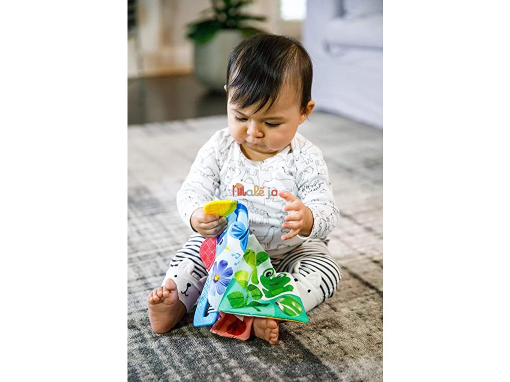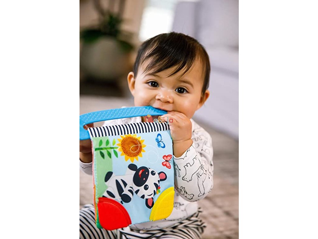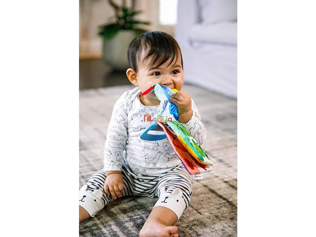 Vďaka mäkkej textúre a tvaru sa dieťatku ľahko drží aj v malých rúčkach. Vrúbkované textúry na rohoch knižky sú navrhnuté tak, aby masírovali boľavé ďasná počas prerezávania prvých zúbkov. Vďaka ľahko uchopiteľnej rukoväti si vaše dieťa môže vziať túto farebnú knižku všade so sebou.