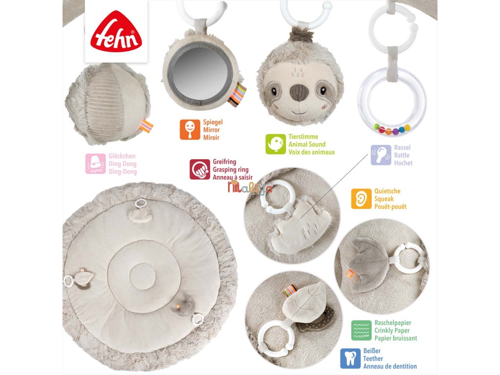 Na dvoch hrazdičkách sú zavesené ďalšie hračky: hrkálka s krúžkami, skrytá rolnička v loptičke, zrkadielko a leňochod s realistickým zvieracím zvukom. Tieto prvky upútajú pozornosť dieťaťa, predĺžia dobu sústredenia a prinesú radosť z hry.