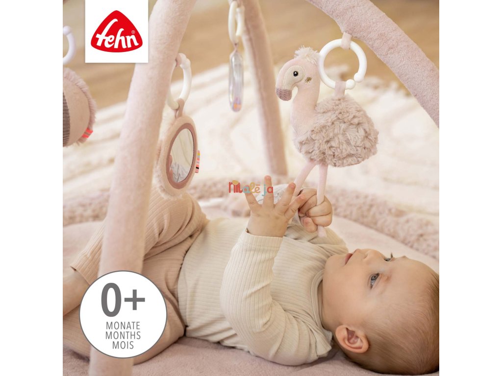 Interaktívna deka s plameniakom a priestorom na ležanie z rôznych hebkých materiálov pozýva bábätko k mojkaniu, objavovaniu a hre. Tri odnímateľné prvky so šuštivým papierom, pískatkom a hrkálkou na deke podporujú hmatové vnímanie a koordináciu ruka–oko.