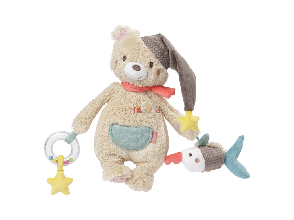 Je to maznavá plyšová hračka a ochranca v jednom, ktorý sa rýchlo stane detským kamarátom. Na rukách má vzrušujúce hračky: prstencový krúžok s farebnými korálkami, plyšovú hviezdičkou a plyšovú rybku. Farebné korálky sa v jej potrubí rozleteli. To podporuje motorické zručnosti a pripravuje veľa radosti. Neobvyklý tvar a rôzne materiály rýb poskytujú skvelú hmatovú a zmyslovú skúsenosť. Vďaka svojmu tvaru zaručuje Bruno najlepšiu zábavu na cestách. Rýchlo sa upevní na kočíky a autosedačky.