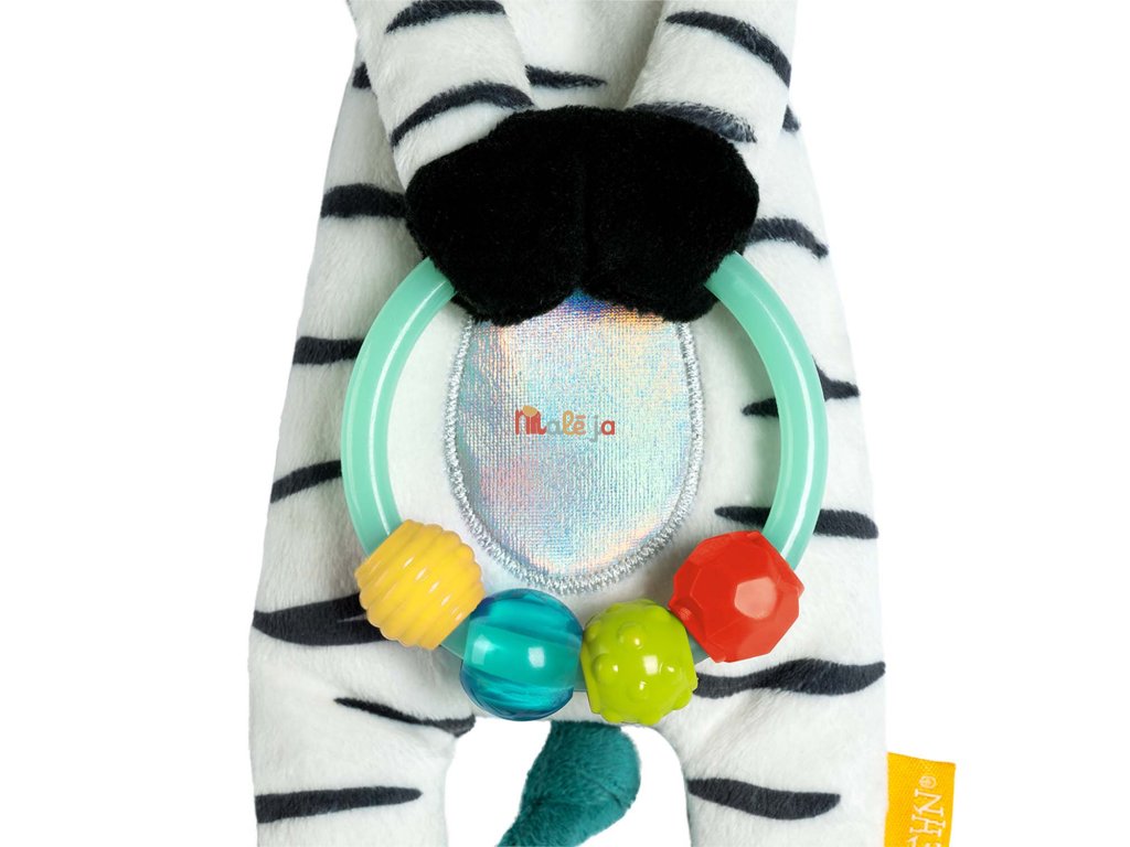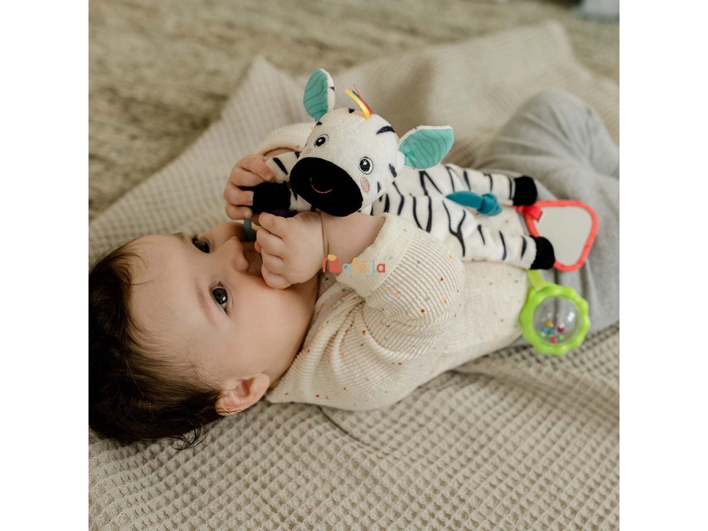 Plyšová hrkálka s množstvom aktivity prvkov ako je úchopový krúžok, hrkálka, pískací mechanizmus a škrípavý papier. Hračka na uchopenie hravo podporuje sluch dieťaťa, zmysel pre zrak, hmat, zdravé uchopenie a logické myslenie – ideálny ako darček pre chlapcov a dievčatá k narodeniu, narodeninám či krstu.