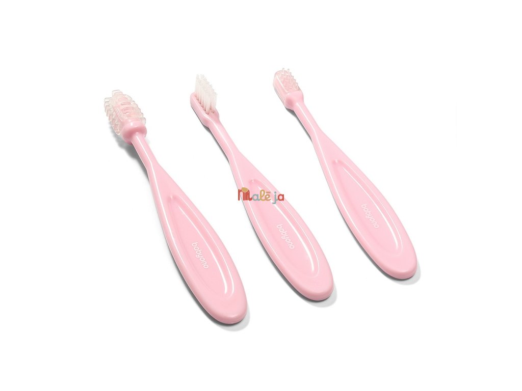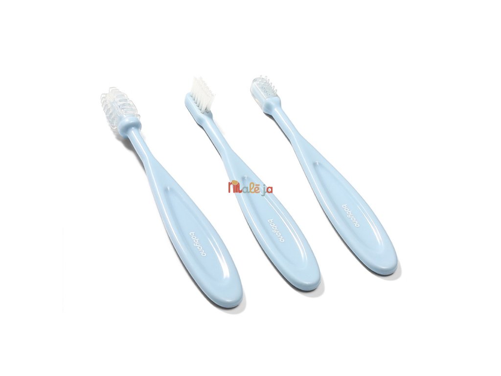 Súprava obsahuje: silikónovú kefku na masáž ďasien, silikónovú kefku na čistenie prvých zúbkov, jemnú kefku s mäkkým vlasom