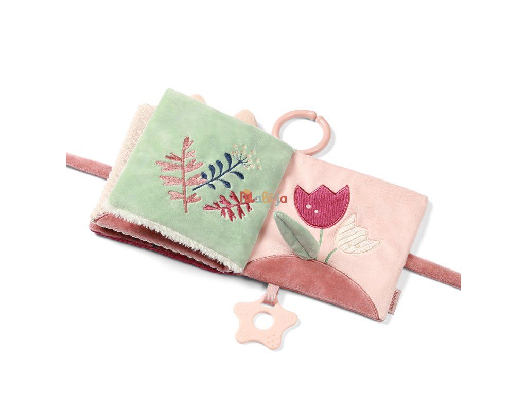 Stránky pri stláčaní vydávajú zaujímavé zvuky, hrkálku na povzbudenie trasenia, zrkadlo na skúmanie vlastného odrazu, visačky a povrázky na povzbudenie uchopenia a hryzátko na masáž ďasien.