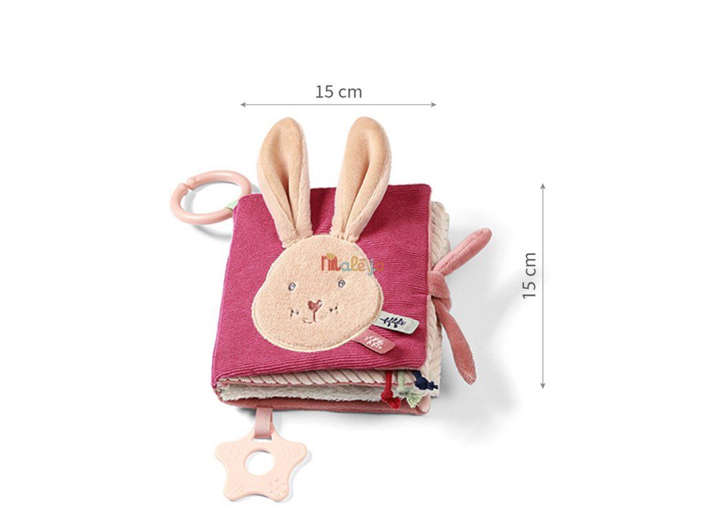 Zaujímavé textúry, rôzne farby a tvary stimulujú fantáziu. Látková kniha má C-krúžok - môžete ju zavesiť na postieľku, kočík alebo autosedačku.