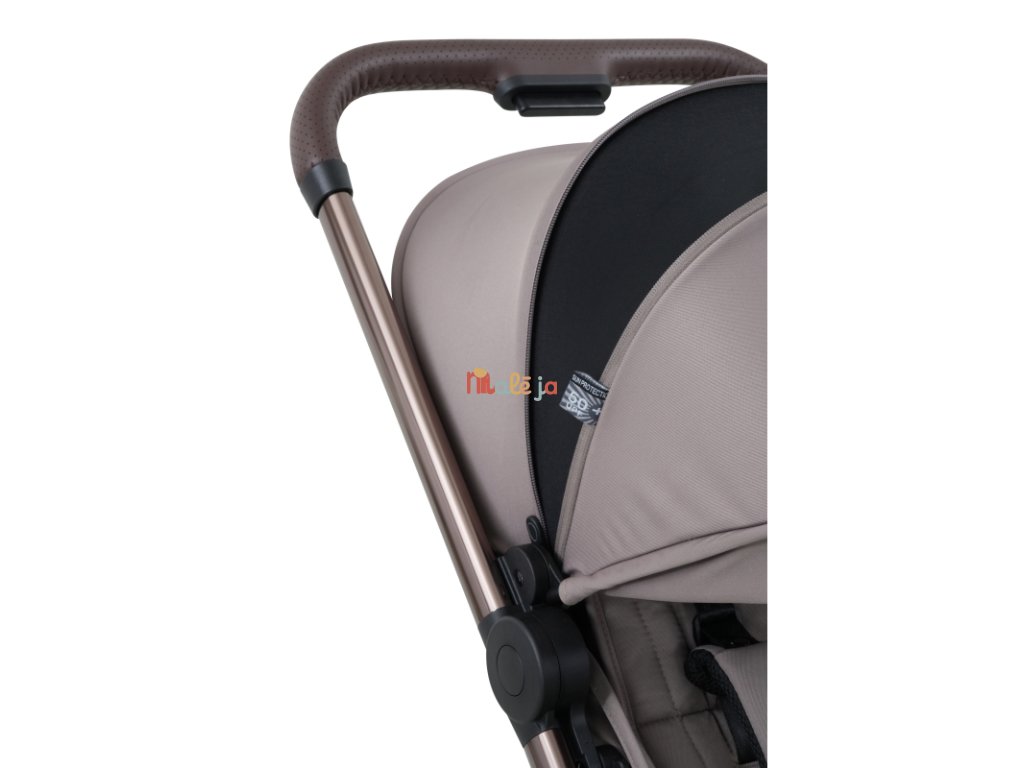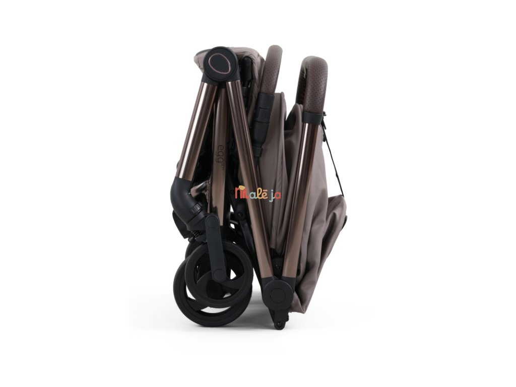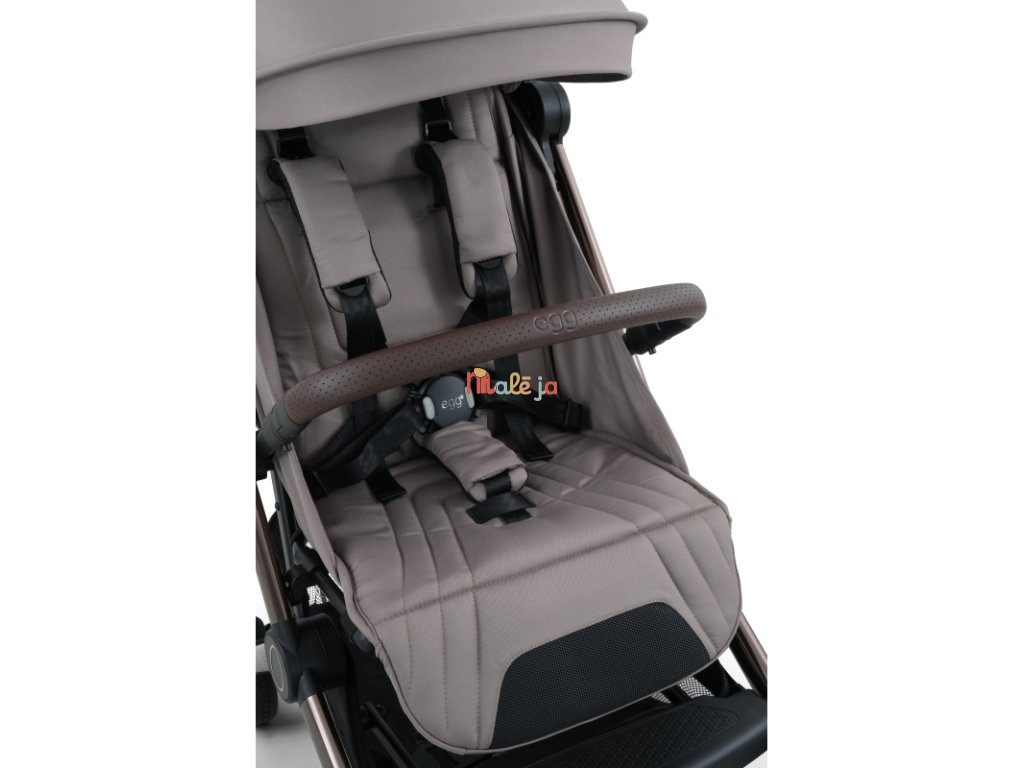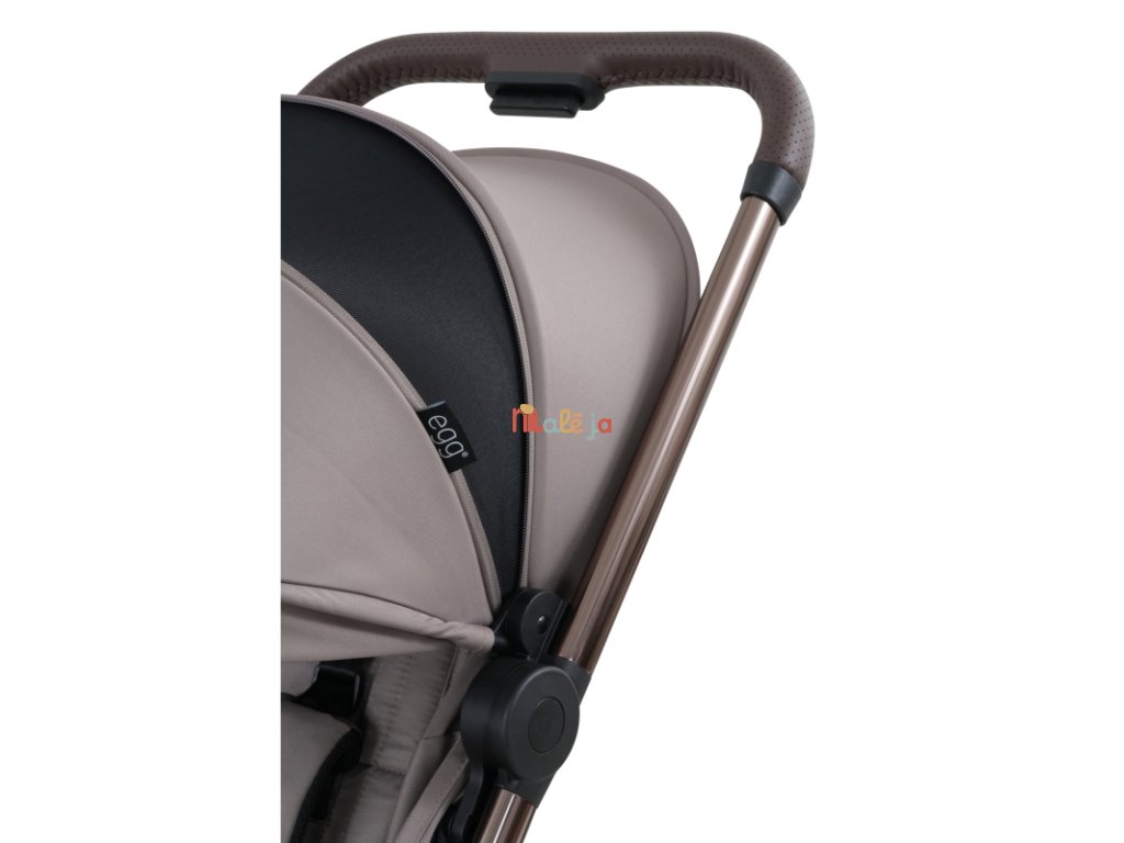 Typické prvky egg® nájdete na každom detaile – od elegantných kriviek a dezénu kolies až po ručne šitú koženkovú rukoväť (s výškou 105 cm) a odnímateľné madlo pred dieťaťom. Každý detail bol starostlivo premyslený pre potreby moderných rodičov, ktorí ocenia spojenie designu a funkčnosti.