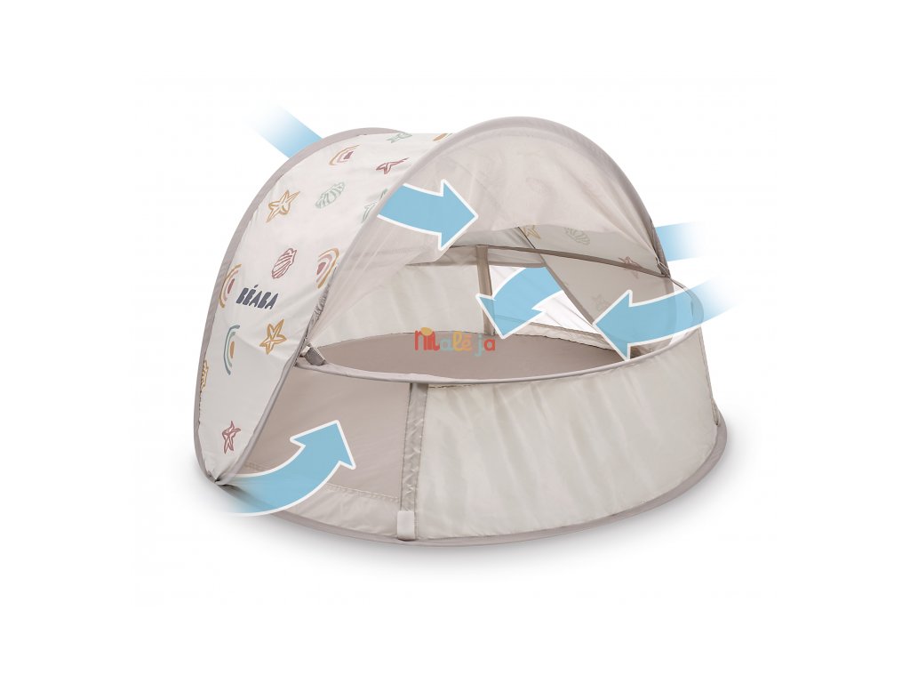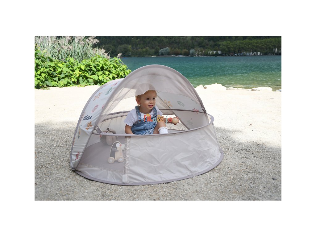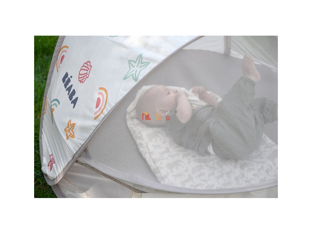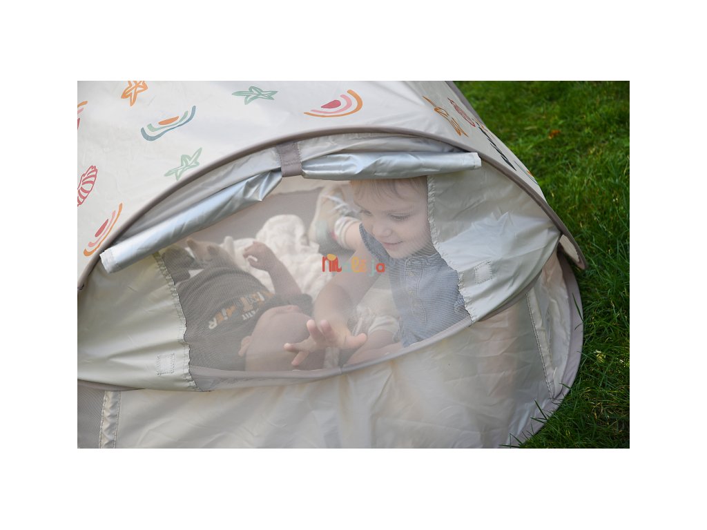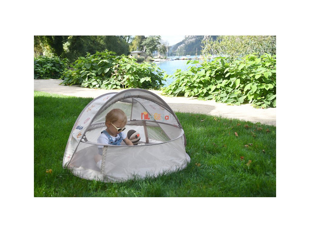 Prenosný univerzálny stan s UV faktorom 50+ na ochranu dieťaťa pred slnkom na záhrade, na pláži či na výletoch do prírody. Stan umožňuje ľahkú ventiláciu vďaka bočným otvorom so sieťovinou a textilnými chlopňami, ktoré je možné zrolovať. Sieťovina chráni dieťa v stane pred ťažkým hmyzom. Tkanina s chladivým efektom pomáha znižovať teplotu vo vnútri stanu.