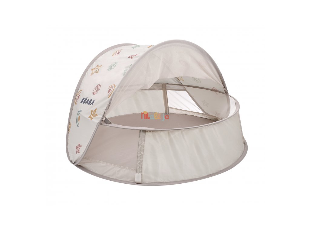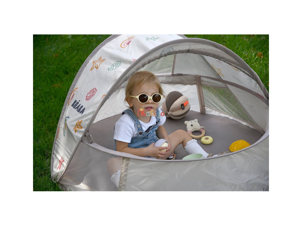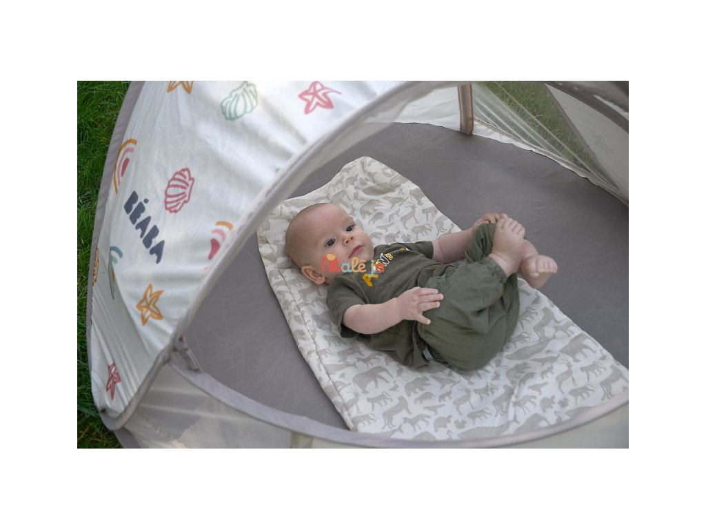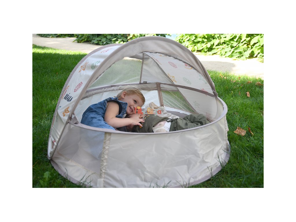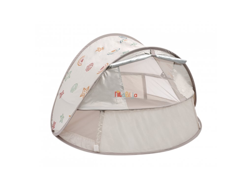 Prenosný univerzálny stan s UV faktorom 50+ na ochranu dieťaťa pred slnkom na záhrade, na pláži či na výletoch do prírody. Stan umožňuje ľahkú ventiláciu vďaka bočným otvorom so sieťovinou a textilnými chlopňami, ktoré je možné zrolovať. Sieťovina chráni dieťa v stane pred ťažkým hmyzom. Tkanina s chladivým efektom pomáha znižovať teplotu vo vnútri stanu.