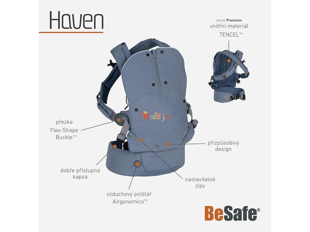 Pre extra pohodlie pri nosení smerom von od tela nosiča Airgonomics ™ vyvinuli v BeSafe jedinečný integrovaný vzduchový vankúš a vložili ho do bedrového pásu BeSafe Haven. Je vybavený špeciálnou klenbou, možnosť nafúknuť behom niekoľkých sekúnd a poskytuje dieťaťu pohodlný priestor na sedenie, zatiaľ čo je posadené smerom von od nosiča. Týmto spôsobom Airgonomics ™ nie len uľahčuje zdravú polohu chrbtice a bedier v tejto pozícii, ale tiež pomáha rozložiť váhu dieťaťa na bedrový pás, aby rodičom poskytol najpohodlnejší spôsob nosenia.