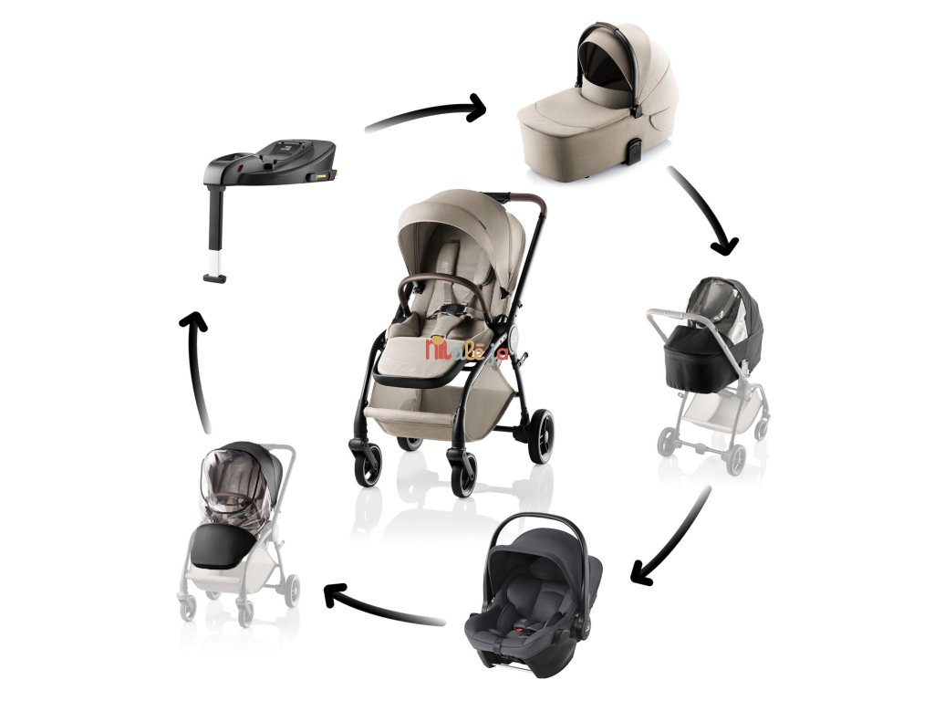 Športový kočík Britax Römer Rio, hlbokú vaničku Britax Römer Rio, autosedačku Baby-Safe Core, základňu Baby-Safe Core Base, pláštenku na kočík Rio a pláštenku na hlbokú vaničku Rio.