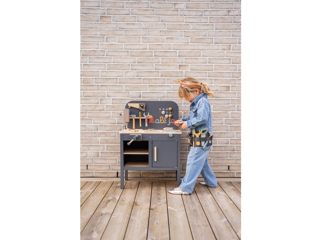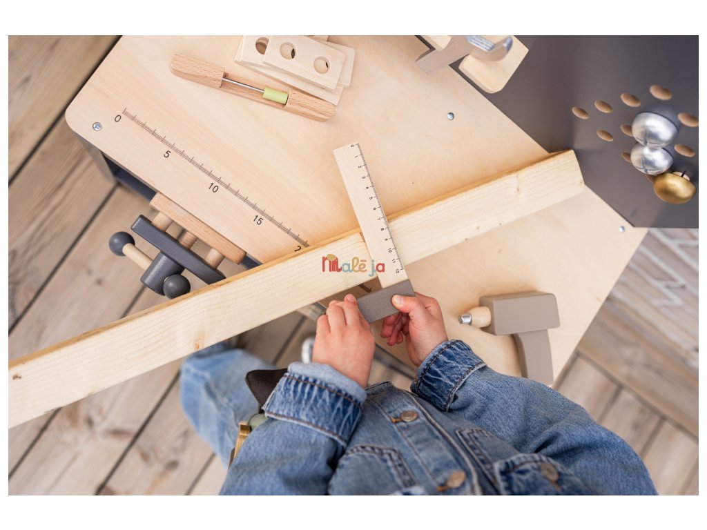 Drevený stolík na náradie posúva vašu stolársku zábavu do nových výšin! Dodáva sa z dreva v peknej šedej farbe.