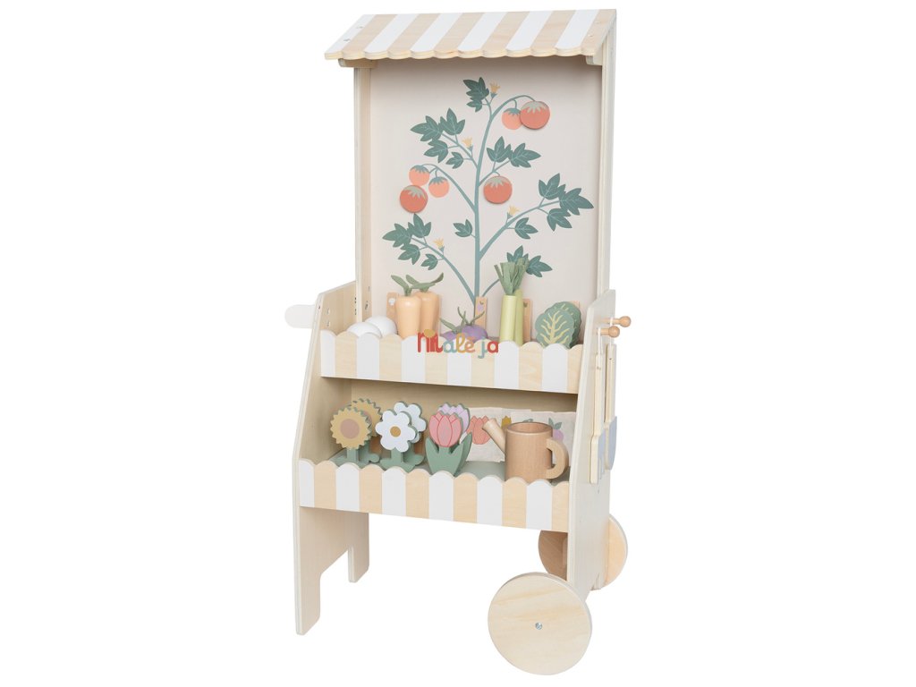 Vozík je plný všetkého, o čom môže začínajúci záhradník snívať – od farebnej zeleniny po nádherné kvety, všetko vyrobené z dreva a pripravené na hru!