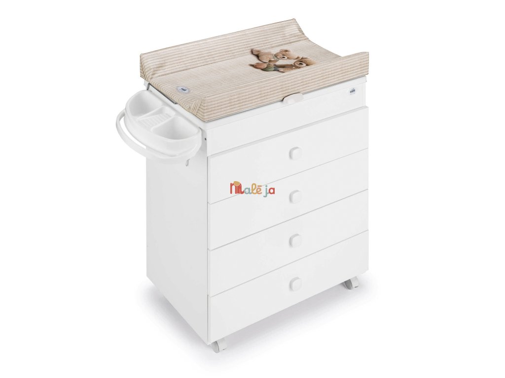 Prebaľovací stôl Asia Bianco od značky Cam ponúka ideálne riešenie pre všetkých rodičov, ktorí hľadajú spojenie praktickosti, bezpečia a elegantného dizajnu. Komfort dieťaťa zabezpečuje mäkká vyklápacia prebaľovacia podložka s bezpečnostným systémom. Stôl je vybavený vaničkou s 2 anatomickými sedadlami (jedna opierka pre bábätká od 0 do 6 mesiacov a druhá s opierkami na ruky pre deti od 6 do 12 mesiacov) a držiakmi na hubku a mydlo. Úložný priestor zahŕňa štyri priestranné zásuvky s kovovými pojazdmi, kde ľahko uložíte všetky potrebné veci. Vďaka drevenej doske možno prebaľovací stôl jednoducho premeniť na štýlovú komodu, ktorú môžete používať aj po skončení obdobia prebaľovania. Manipuláciu uľahčujú štyri kolieska, z ktorých dve sú vybavené brzdami pre zaistenie stability a bezpečnosti.