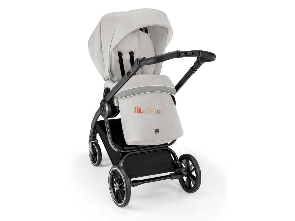 Podvozok Techno má odpruženú konštrukciu a praktické prídavné zariadenia, ktoré sa dajú ľahko nasadiť v oboch smeroch. O pohodlnú jazdu sa postarajú veľké zadné a predné kolesá s aretáciou. Navyše majú všetky ľahkú konštrukciu - sú vyrobené z materiálu EVA. Ich veľkou výhodou je, že sa nedajú prepichnúť. Takže sa na ne môžete stopercentne spoľahnúť, keď ste na cestách. Výškovo nastaviteľná rukoväť s ručným prešívaním z ekokože dopĺňa tento štýlový a praktický kočík. Počas jázd alebo výletov oceníte priestranný nákupný košík, do ktorého môžete umiestniť potraviny alebo všetky potrebné veci. Podvozok kočíka sa navyše ľahko skladá. V zloženom stave je veľmi kompaktný, samostatne stojí a vďaka hmotnosti len 7 kg sa s ním ľahko manipuluje.