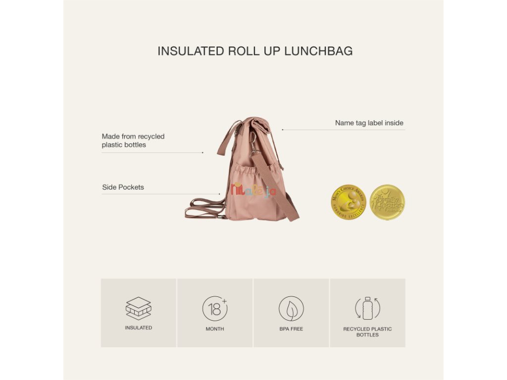 Náš termobatoh s rolovacím zatváraním je vyrobený z udržateľného materiálu z recyklovaných plastových PET fliaš.