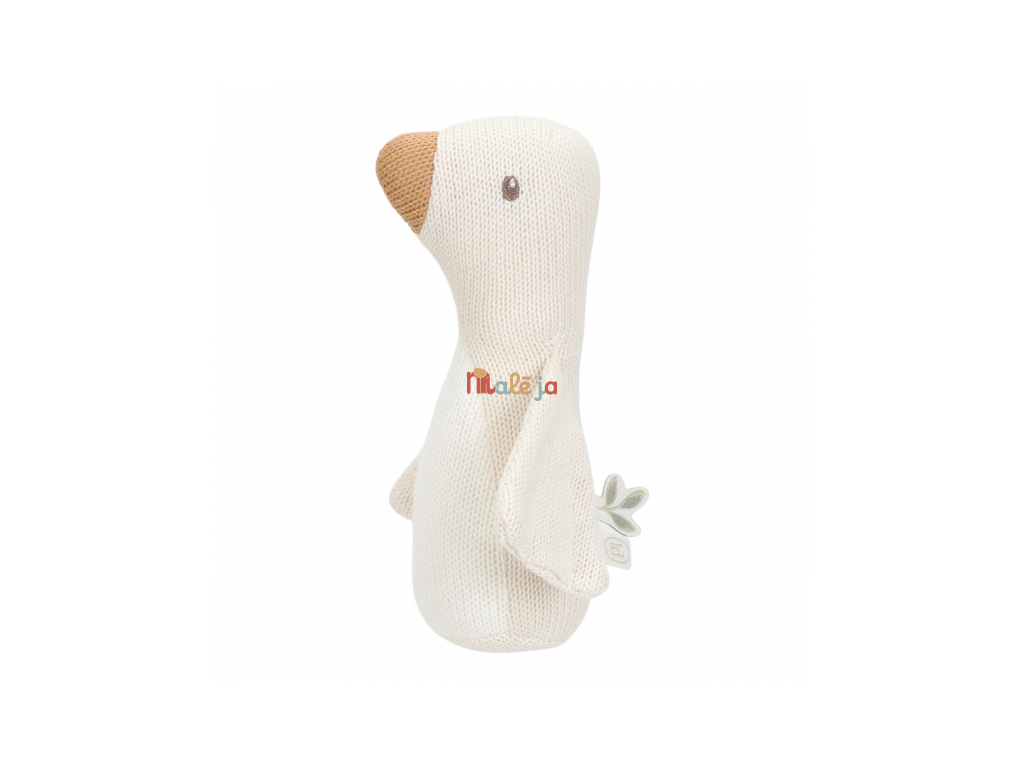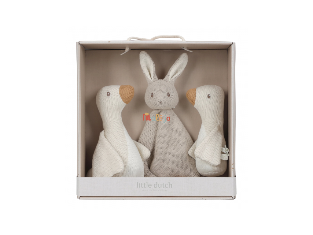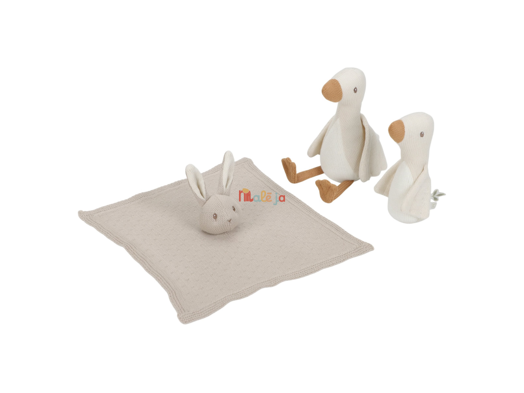 Krásna darčeková sada hračiek z jemnej pleteniny je ideálna ako darček pre novonarodené bábätko. Sada obsahuje maznáčika s králikom a dve hračky v podobe husi.