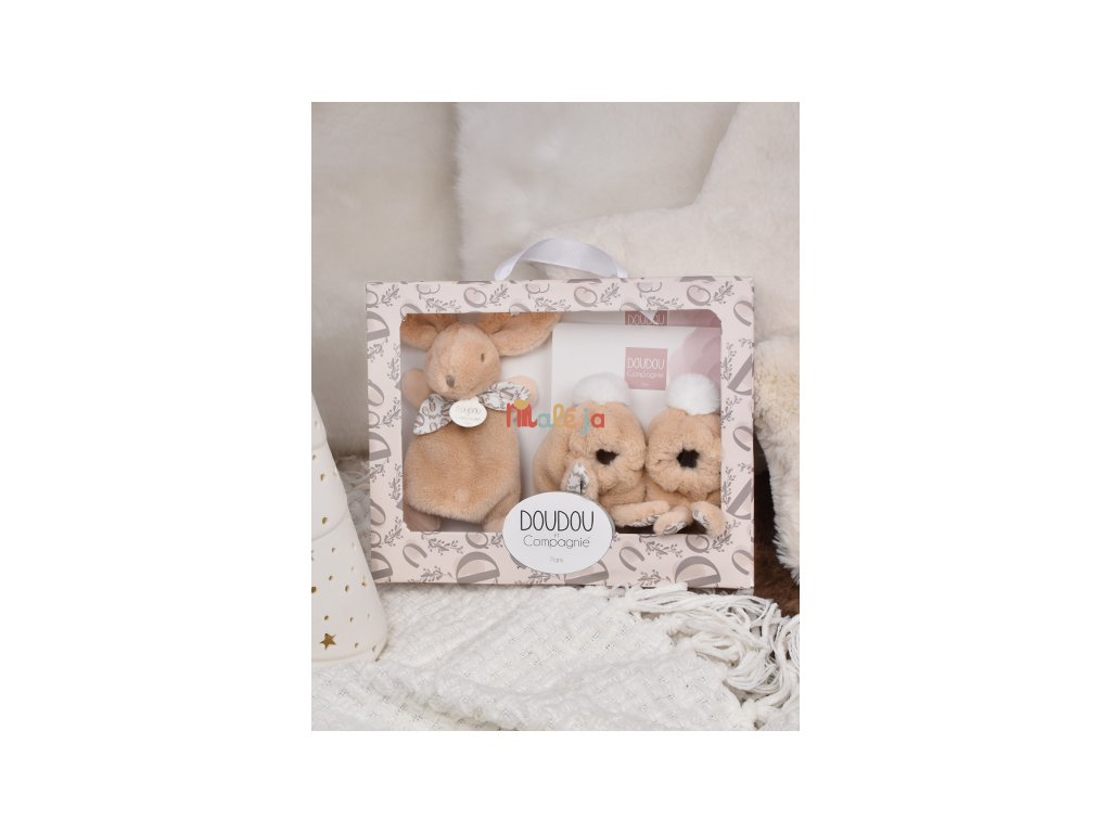 V tejto elegantnej darčekovej krabičke nájdete 15 cm mojkáčika zajačika a mäkkučké papučky v zodpovedajúcom dizajne.