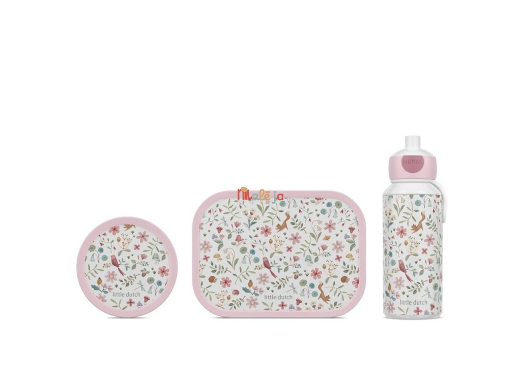 Desiatovú sadu tvorí fľaša s vyskakovacím náustkom, desiatový box s možnosťou rozdelenia na tri priehradky a box na ovocie.