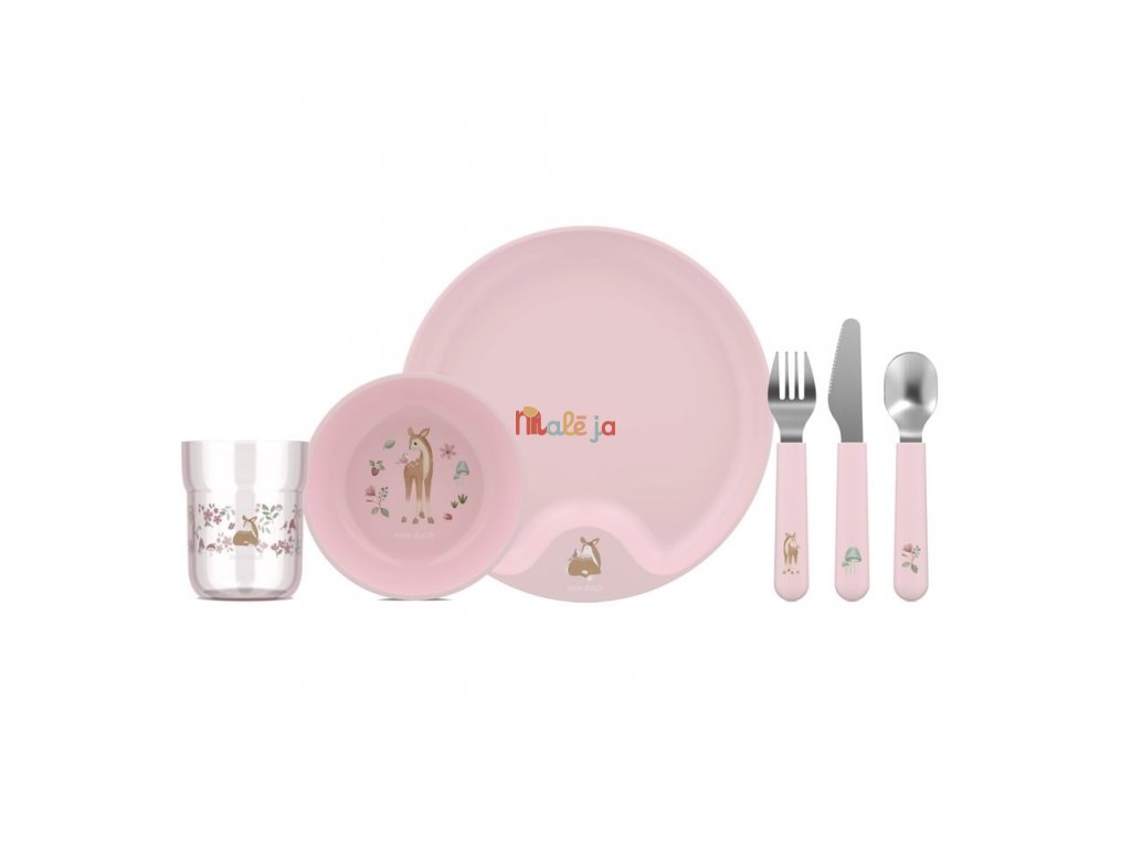 6-dielna jedálenská súprava v krásnom dizajne s jemnou potlačou obsahuje detský tanier, misku, téglik, lyžicu, vidličku a nôž.