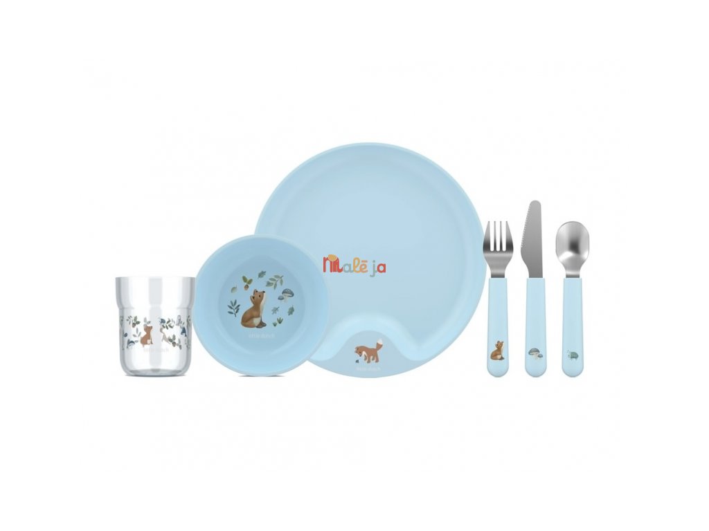 6-dielna jedálenská súprava v krásnom dizajne s jemnou potlačou obsahuje detský tanier, misku, téglik, lyžicu, vidličku a nôž.