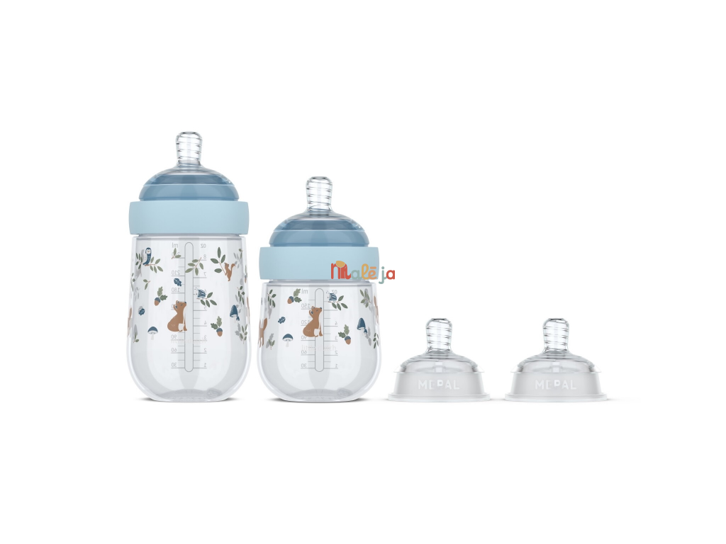 Sada dojčenských fliaš Little Dutch s krásnou potlačou a cumlíkom s antikolikovým ventilom obsahuje dve fľaše (165 ml a 240 ml) so cumlíkom s pomalým prietokom, vhodné pre deti od narodenia, a dva cumlíky so stredným prietokom, vhodné pre deti od 3 mesiacov.