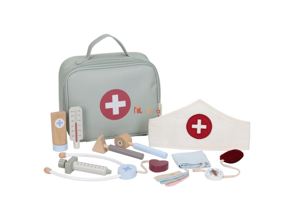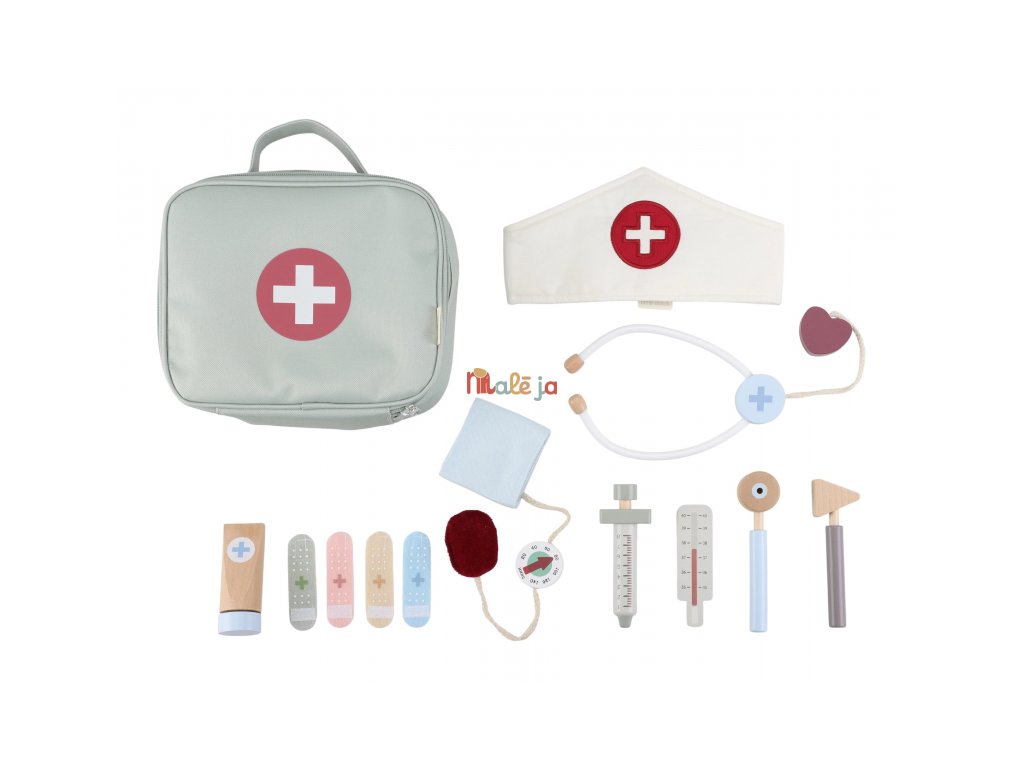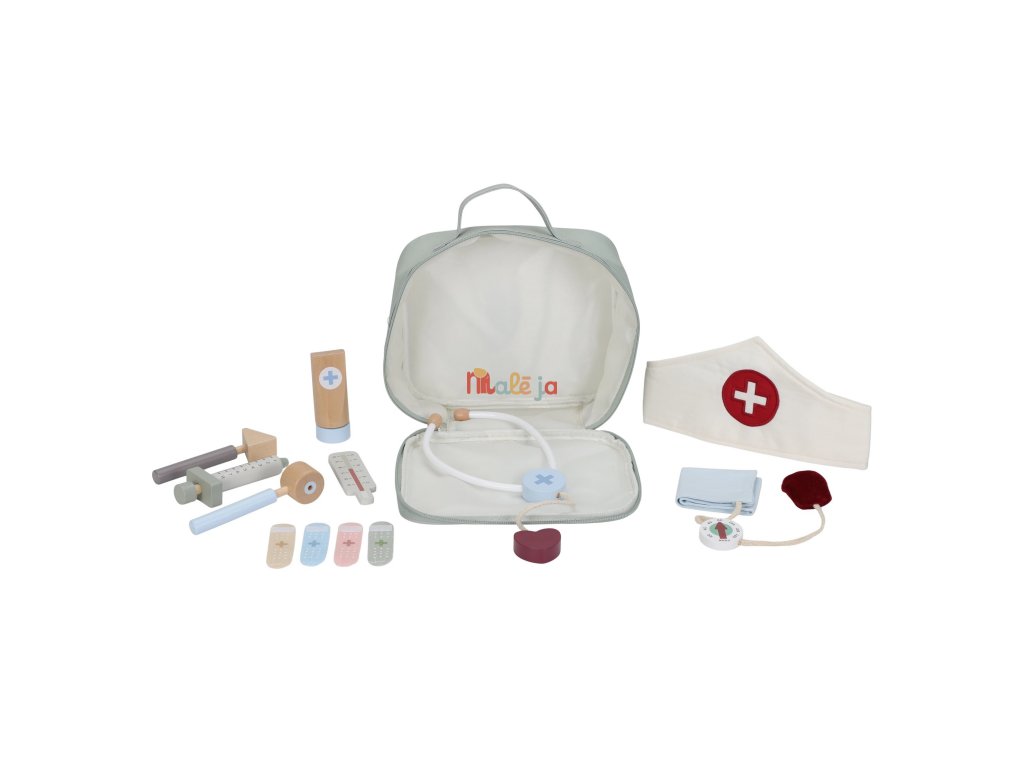Pani doktorka, pán doktor – mohli by ste sa na mňa pozrieť? S touto krásnou drevenou doktorandskou sadou bude vaše dieťa pripravené postarať sa o každého pacienta. Textilná lekárska taška ukrýva všetko základné vybavenie: teplomer, injekciu, obväzy, stetoskop, tlakomer a dokonca aj doktorskú čiapku. Hra na lekára podporuje rozvoj empatie, fantázie a pomáha deťom lepšie porozumieť tomu, čo sa deje pri skutočnej návšteve ordinácie. Ideálna hračka pre všetkých malých ošetrovateľov a lekárov. Drevené časti sú vyrobené z odolného FSC certifikovaného dreva. Vhodné pre deti od 3 rokov.