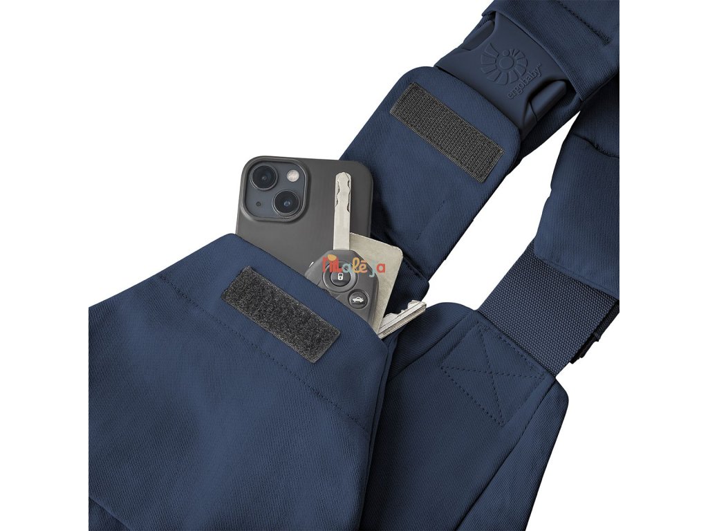 - Veľká predná kapsa pojme všetky potrebné veci na cestách (telefón, karty, kľúče a ďalšie drobnosti).