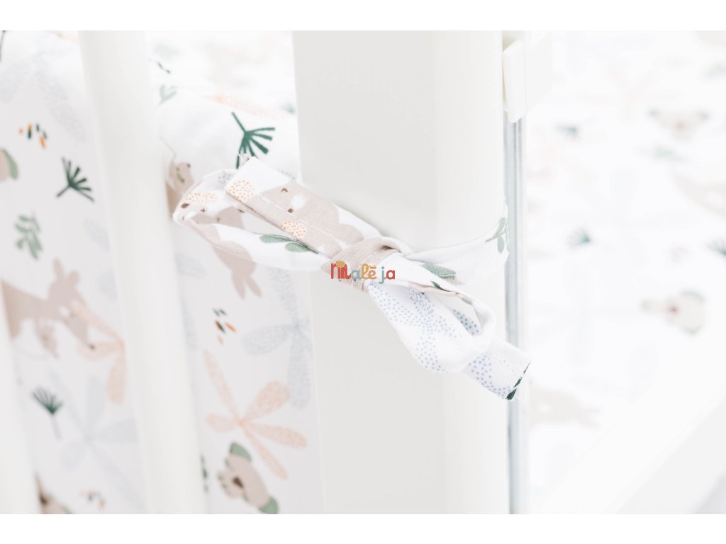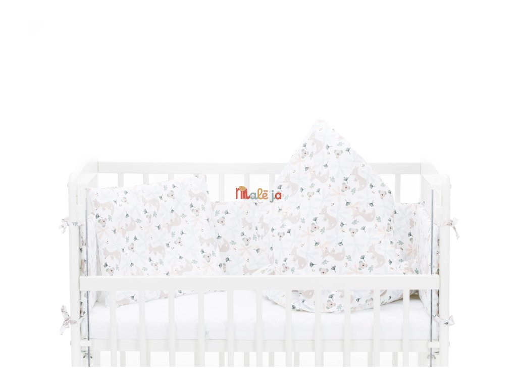 Mantinel lze snadno připevnit k bočnicím pomocí stuh a vytváří bezpečný a klidný prostor pro spánek. Deka i polštář mají polyesterovou výplň a jsou opatřeny měkkými, k pokožce šetrnými bavlněnými potahy se zipem pro snadné převlékání. Všechny části setu lze prát, což oceníte při každodenním používání.
