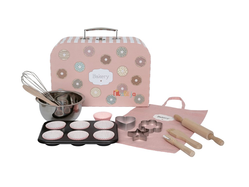 Nechajte deti otvoriť si vlastnú pekáreň s týmto krásnym pekárskym setom v jemných pastelových farbách. Obsahuje všetko potrebné na zábavné pečenie – formičky na muffiny, misu, stierku a roztomilé vykrajovačky, to všetko uložené v hravej taške s motívom donutov. Tento typ hračky podporuje kreatívnu hru a zároveň deti zoznamuje s kúzlom pečenia. Ideálny pre malých pekárov, ktorí chcú experimentovať vo svojej detskej kuchynke a potešiť rodinu či kamarátov vlastnými nápaditými dobrotami.
