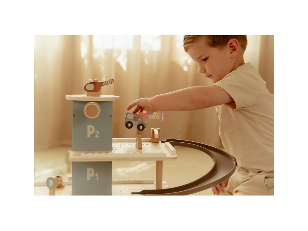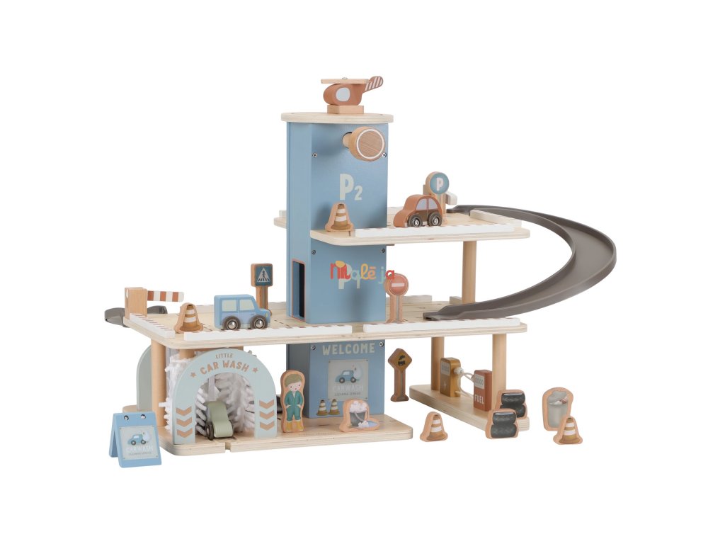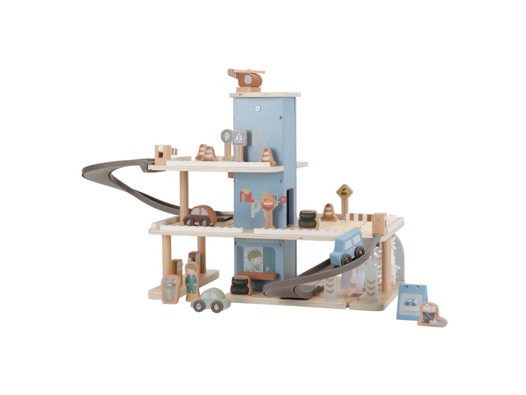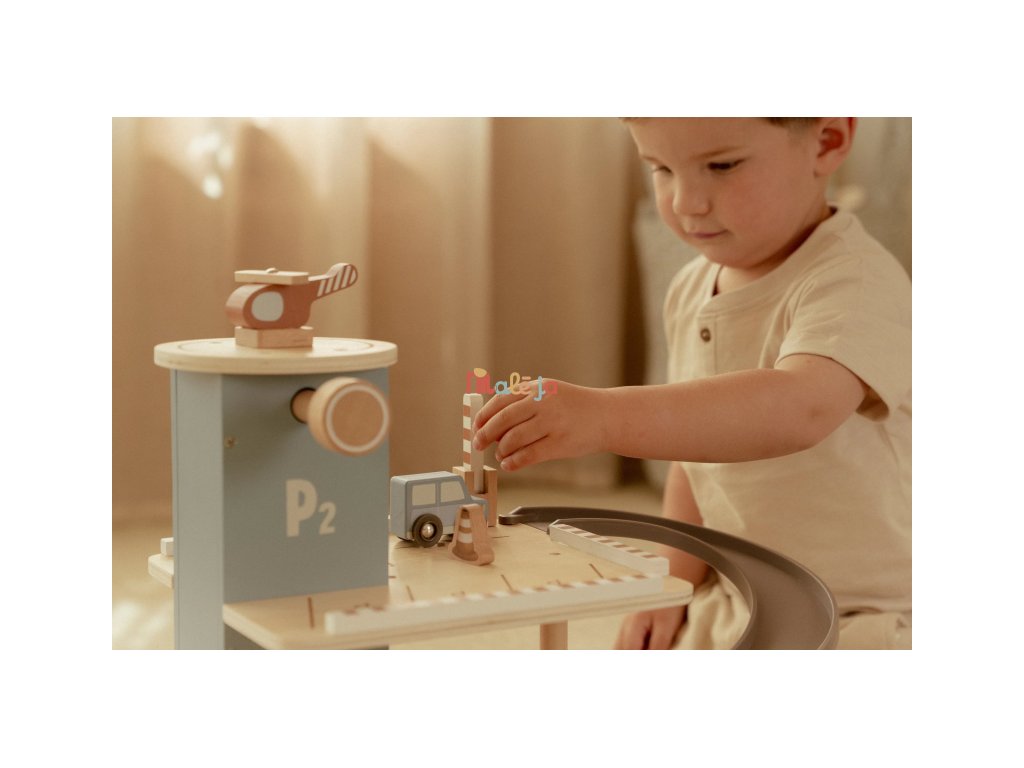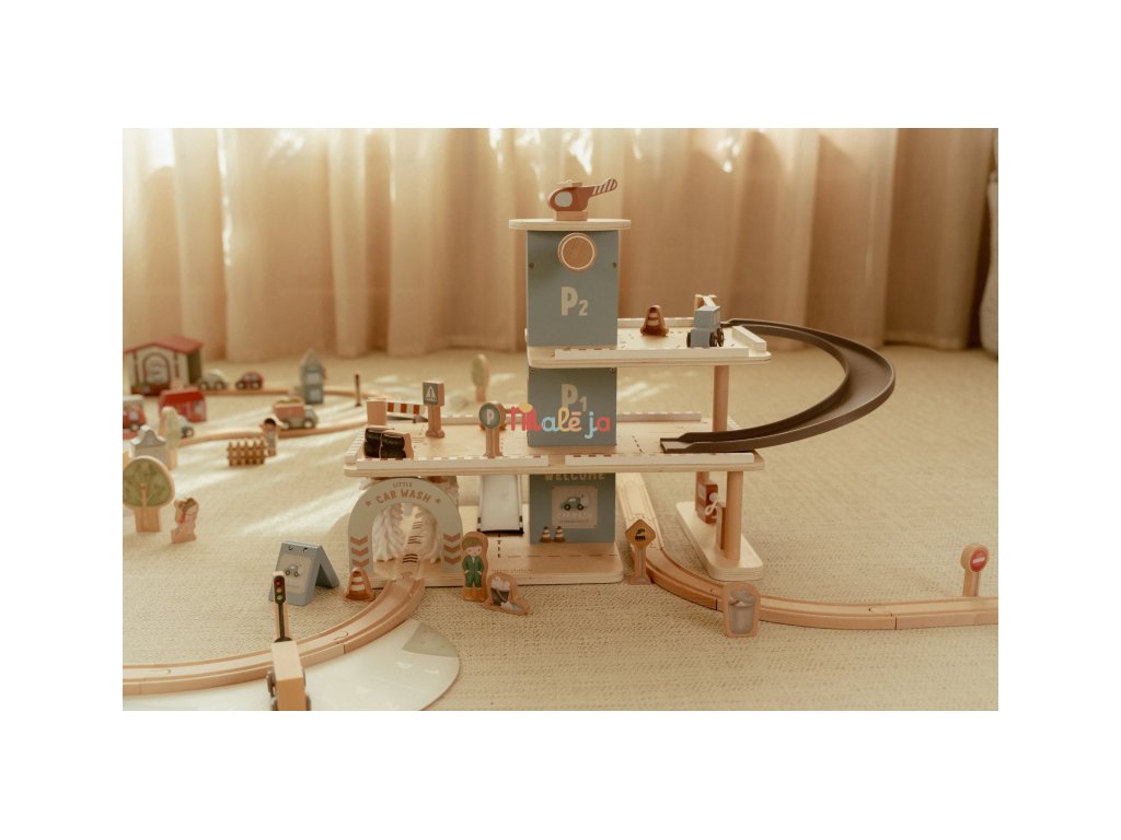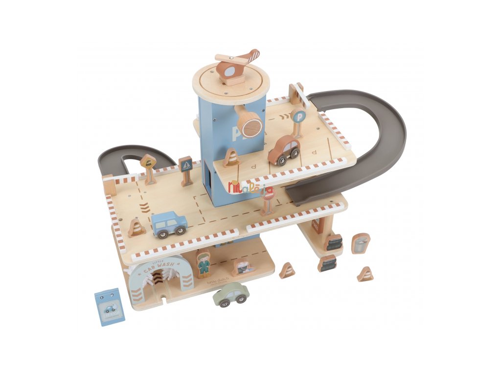 Zaparkuj, natankuj a hurá na výlet! Garáž má prízemie s umývačkou, dve poschodia na parkovanie, nabíjaciu stanicu pre elektromobily a pristávaciu plochu pre vrtuľník na streche. V balení ďalej nájdete tri drevené autíčka, vrtuľník, figúrku vodiča a ďalšie doplnky (dopravné značky, kužele, pneumatiky, vedro atď.). Garáž je ideálnym rozšírením vláčikodráhy Little Dutch, ale skvele poslúži aj ako samostatná hračka pre všetkých malých milovníkov áut. Vďaka robustnému spracovaniu a mnohým herným prvkom garáž podporuje rozvoj jemnej motoriky, predstavivosti a samostatnej hry. Vyrobené z odolného FSC certifikovaného dreva. Vhodné pre deti od 3 rokov.