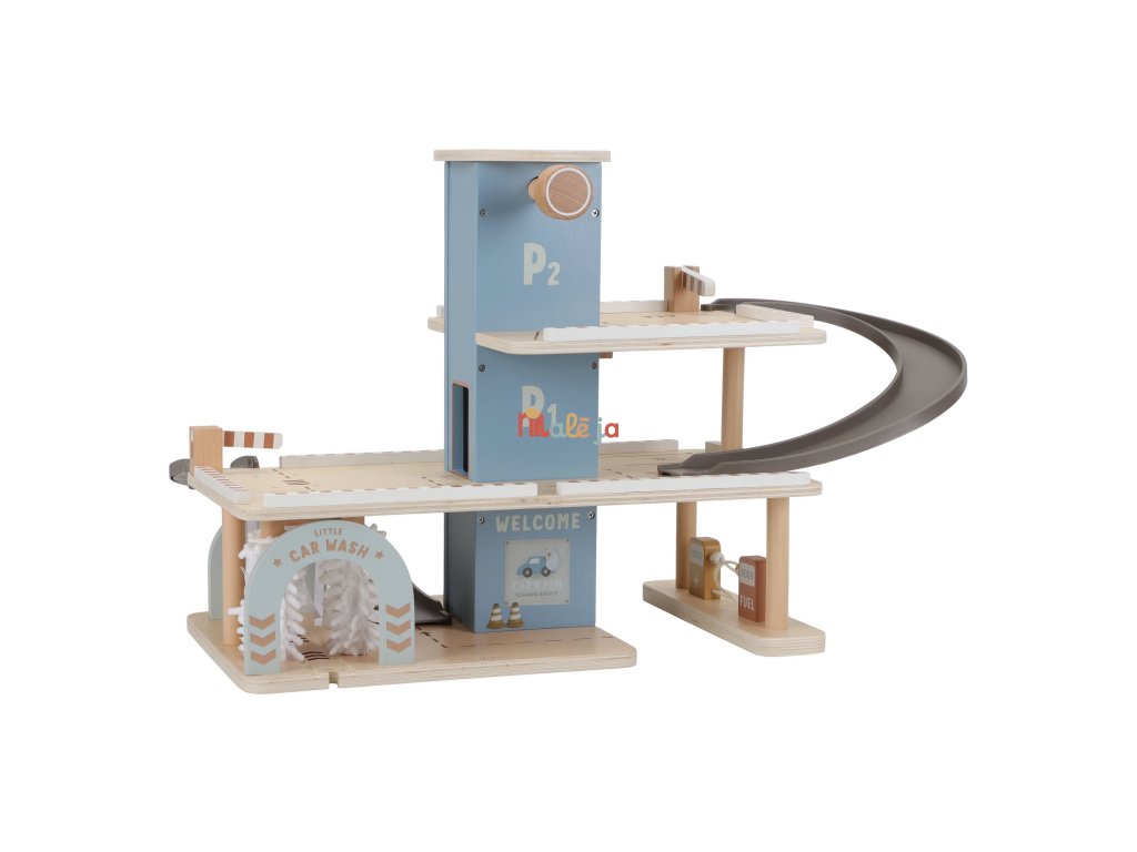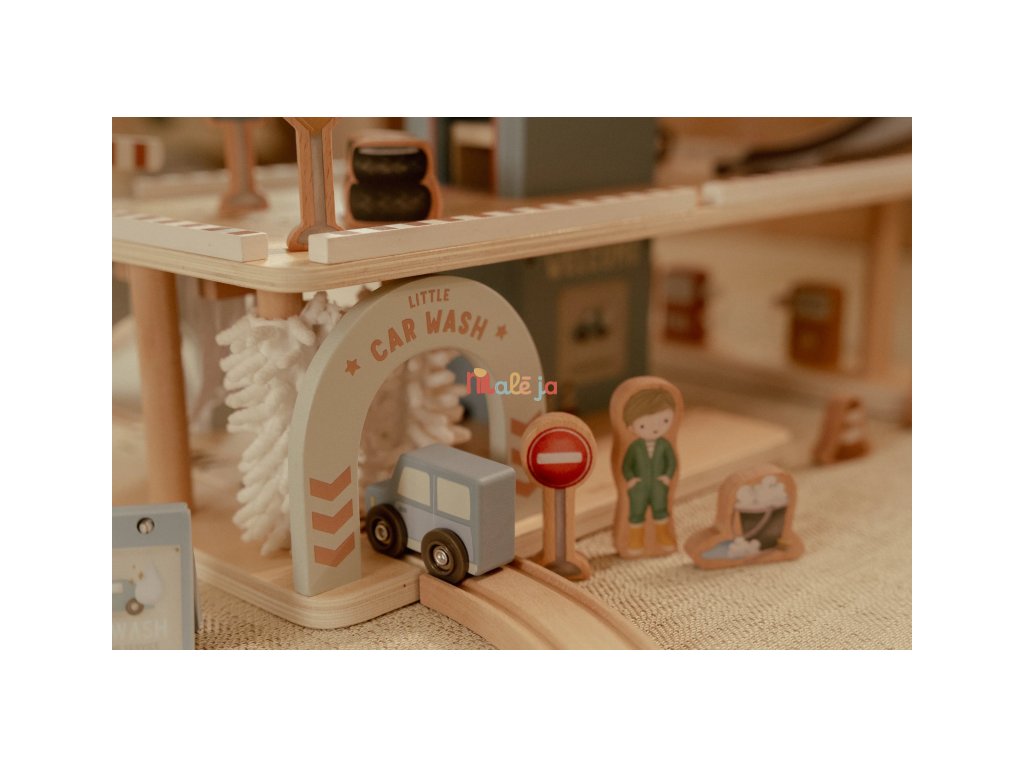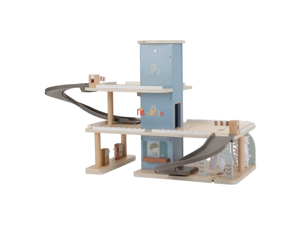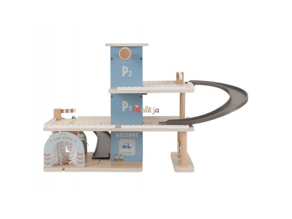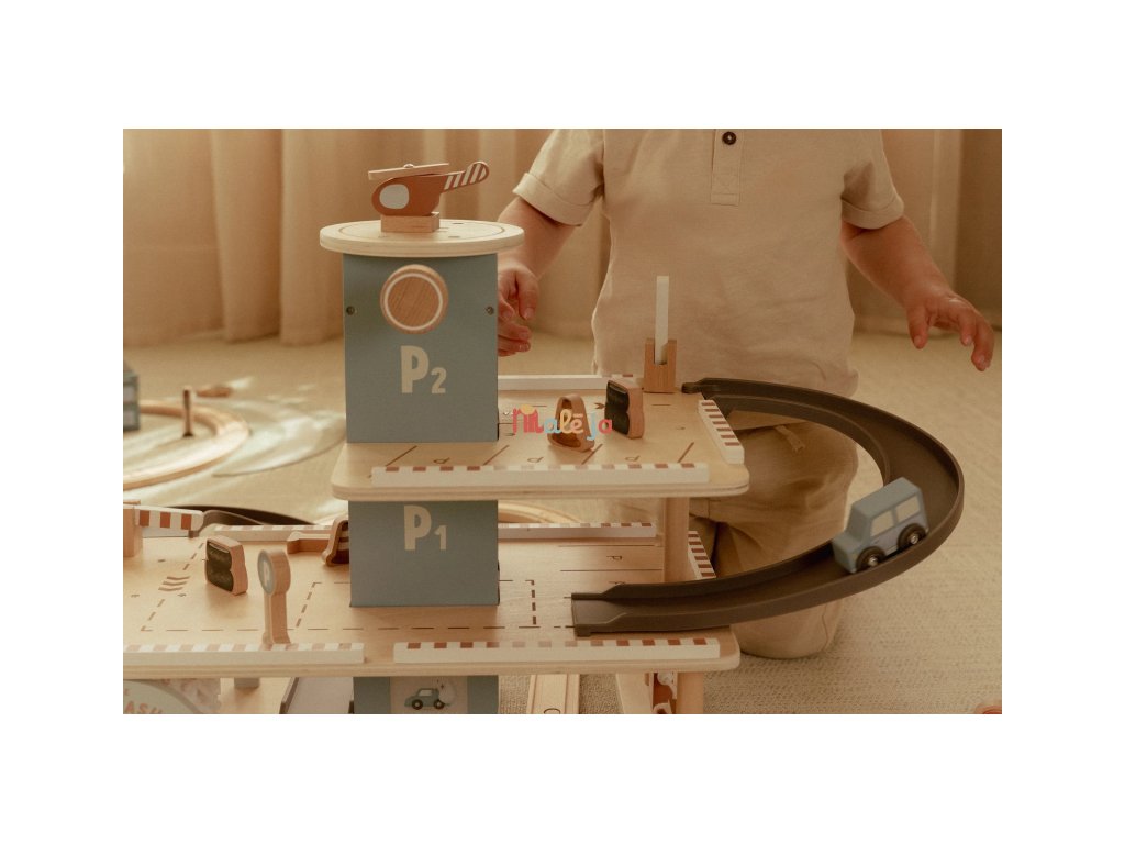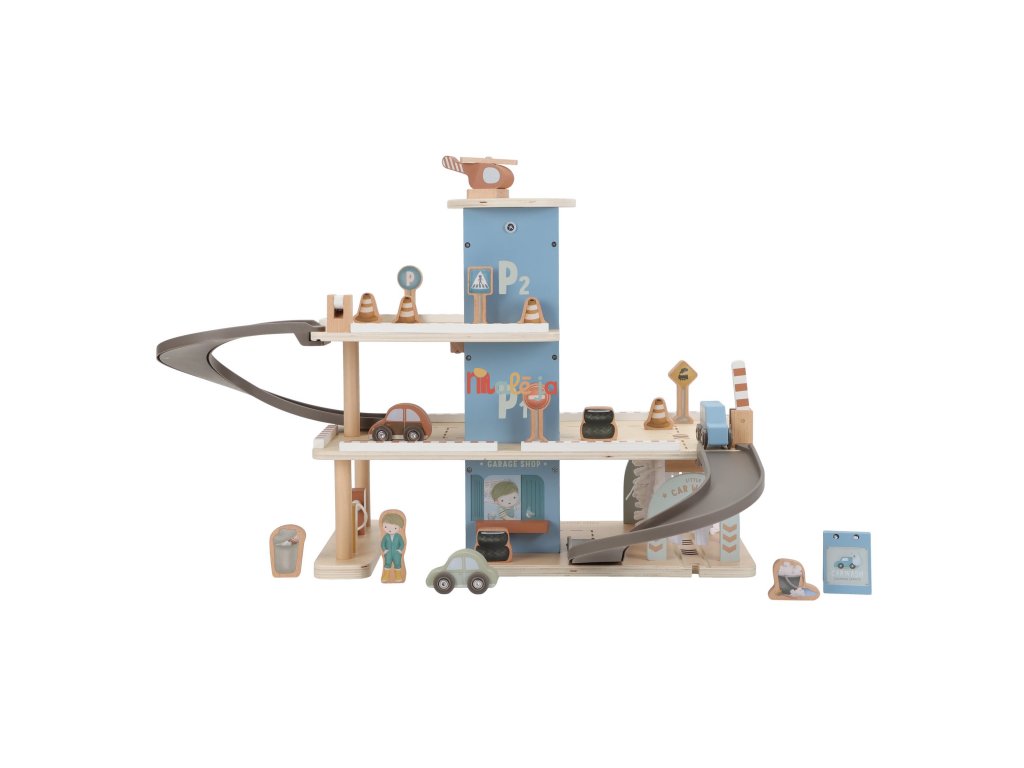 Zaparkuj, natankuj a hurá na výlet! Garáž má prízemie s umývačkou, dve poschodia na parkovanie, nabíjaciu stanicu pre elektromobily a pristávaciu plochu pre vrtuľník na streche. V balení ďalej nájdete tri drevené autíčka, vrtuľník, figúrku vodiča a ďalšie doplnky (dopravné značky, kužele, pneumatiky, vedro atď.). Garáž je ideálnym rozšírením vláčikodráhy Little Dutch, ale skvele poslúži aj ako samostatná hračka pre všetkých malých milovníkov áut. Vďaka robustnému spracovaniu a mnohým herným prvkom garáž podporuje rozvoj jemnej motoriky, predstavivosti a samostatnej hry. Vyrobené z odolného FSC certifikovaného dreva. Vhodné pre deti od 3 rokov.