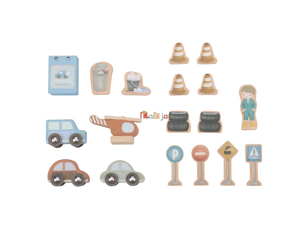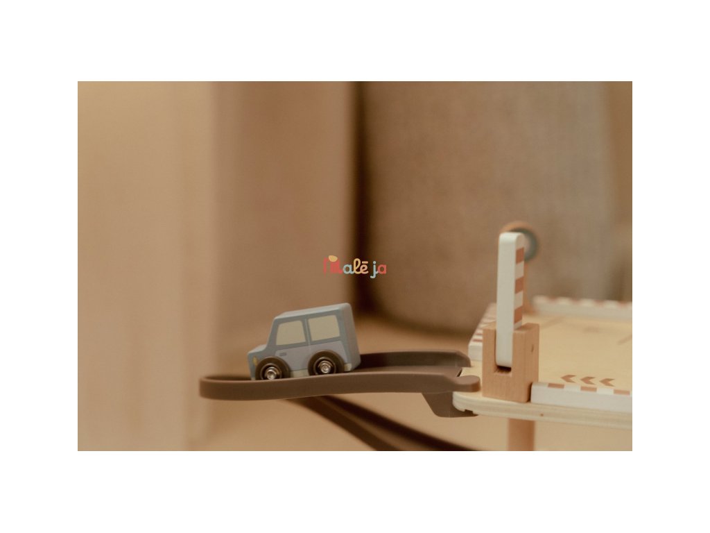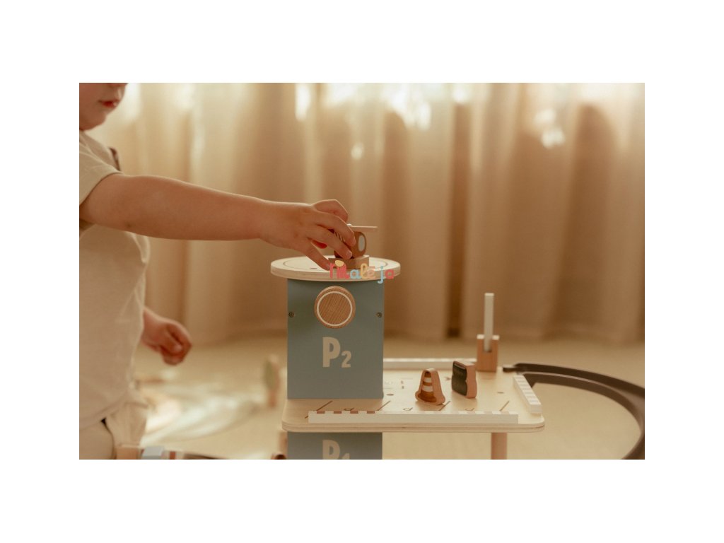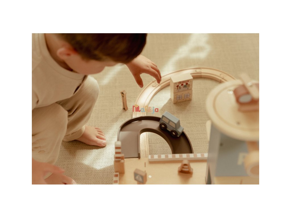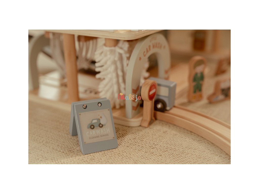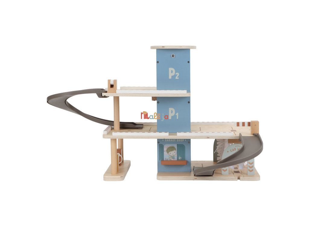 Zaparkuj, natankuj a hurá na výlet! Garáž má prízemie s umývačkou, dve poschodia na parkovanie, nabíjaciu stanicu pre elektromobily a pristávaciu plochu pre vrtuľník na streche. V balení ďalej nájdete tri drevené autíčka, vrtuľník, figúrku vodiča a ďalšie doplnky (dopravné značky, kužele, pneumatiky, vedro atď.). Garáž je ideálnym rozšírením vláčikodráhy Little Dutch, ale skvele poslúži aj ako samostatná hračka pre všetkých malých milovníkov áut. Vďaka robustnému spracovaniu a mnohým herným prvkom garáž podporuje rozvoj jemnej motoriky, predstavivosti a samostatnej hry. Vyrobené z odolného FSC certifikovaného dreva. Vhodné pre deti od 3 rokov.