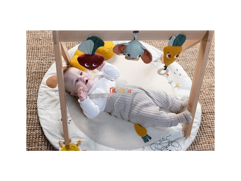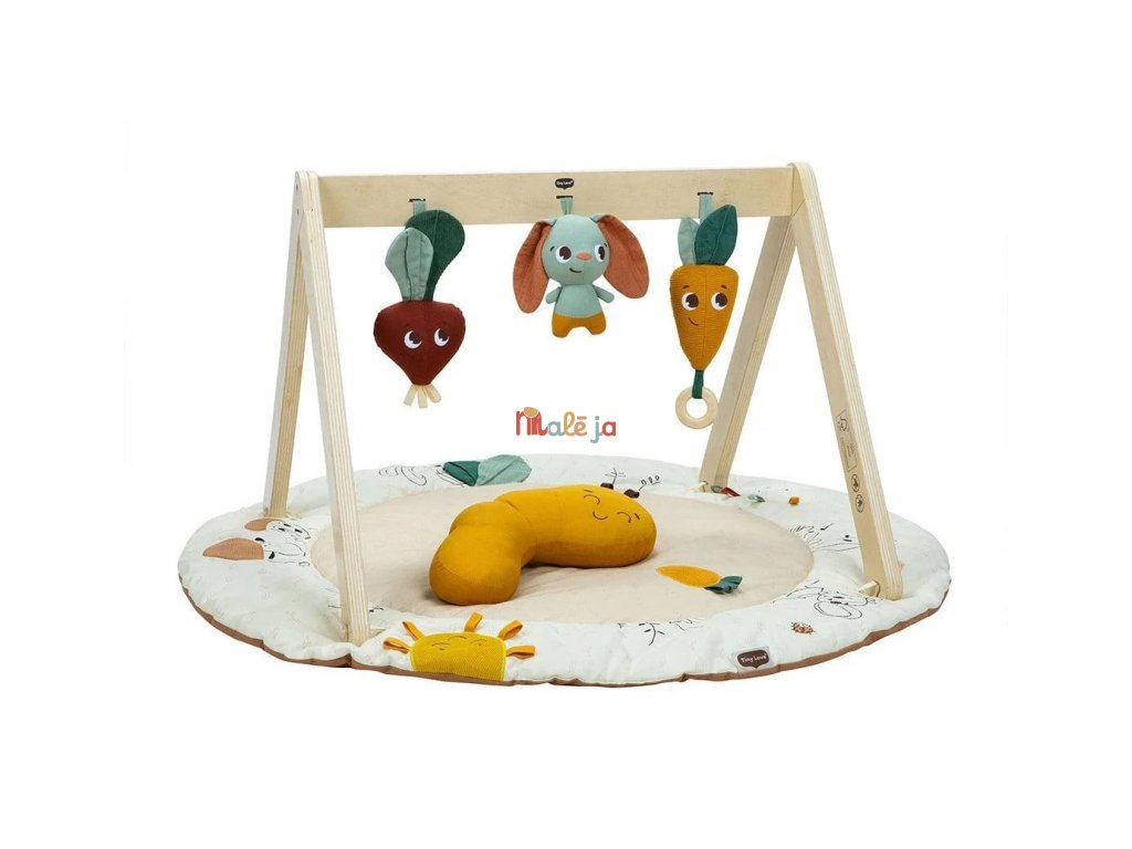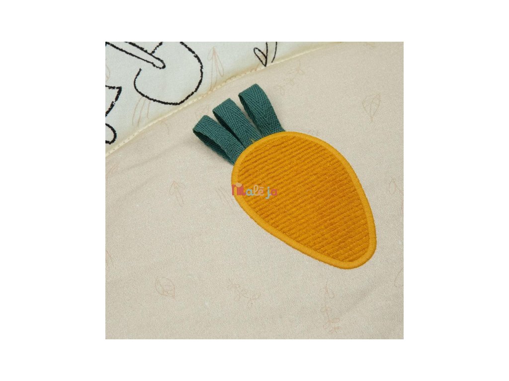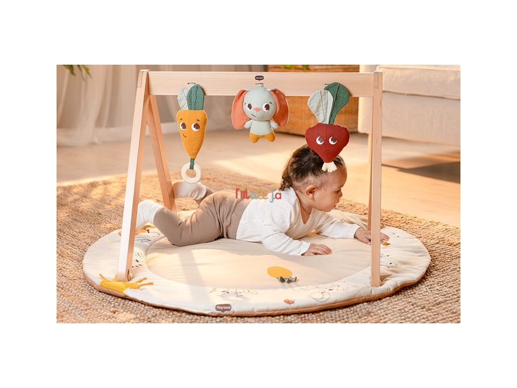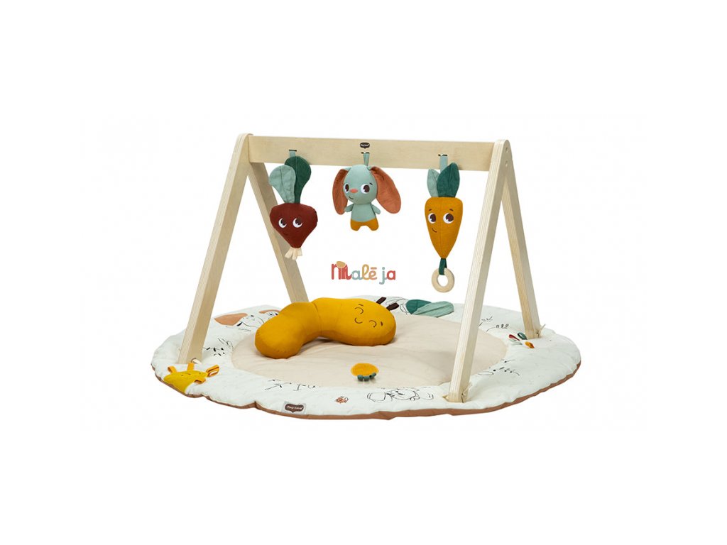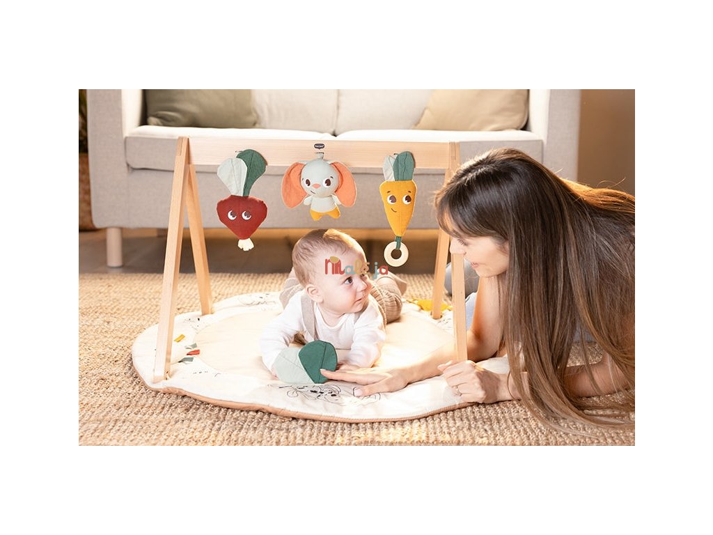 Odnímateľná drevená hrazda umožňuje zavesenie hračiek v podobe chrastiacej repy, rozkošného zajačika a mrkvičky s krúžkom na uchopenie. Priamo na deke nájdete textilné aplikácie s rôznymi textúrami na skúmanie.