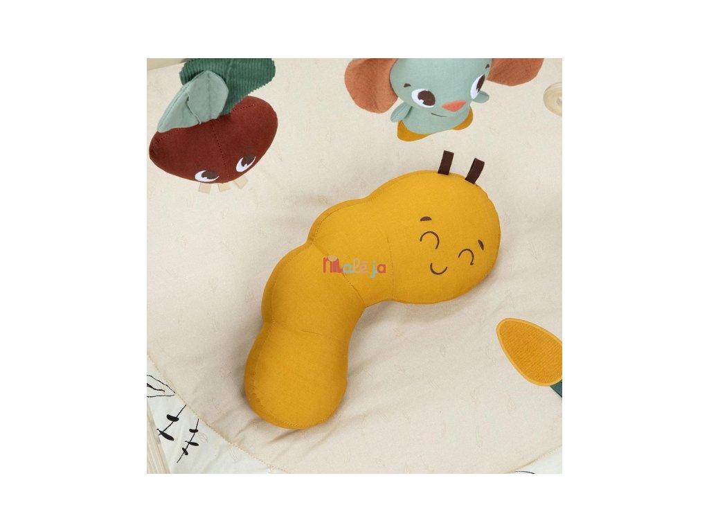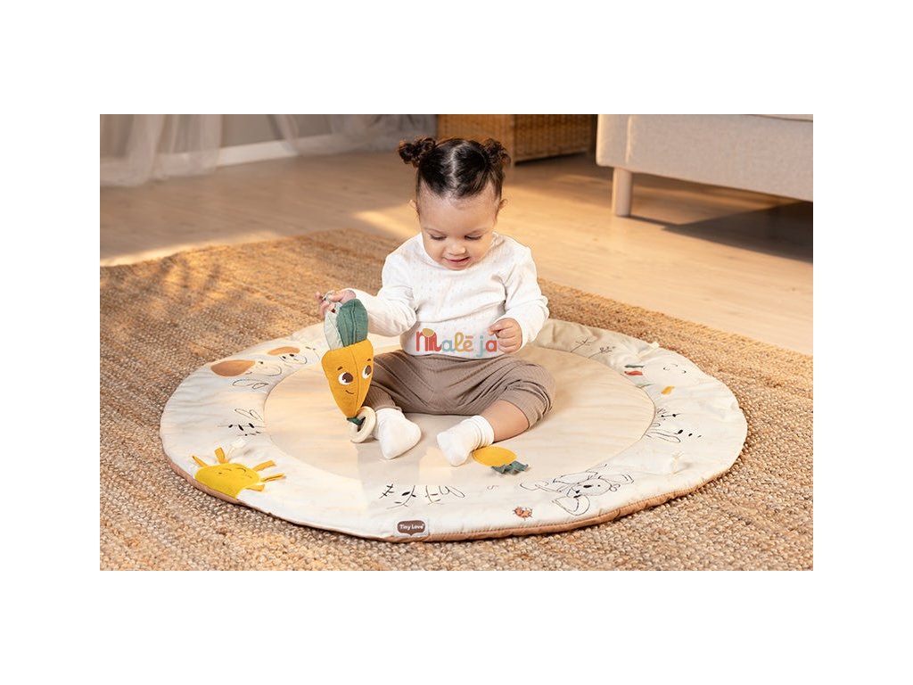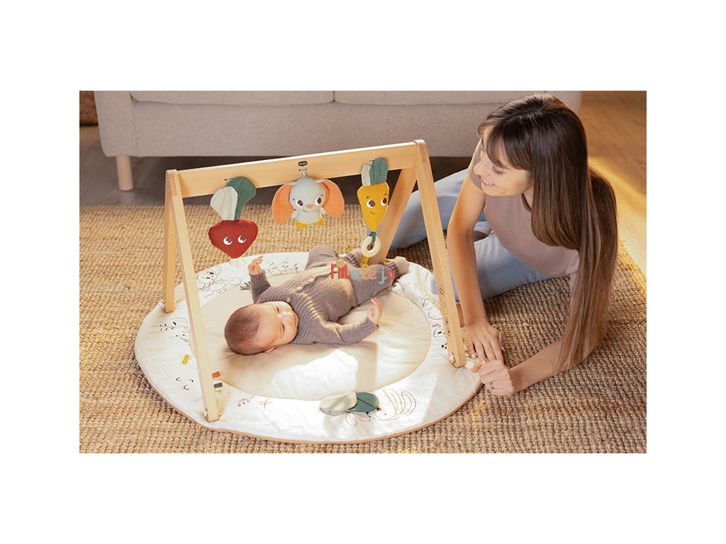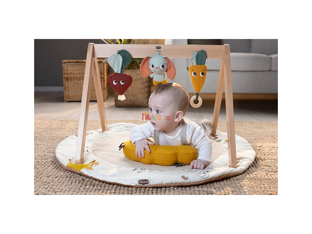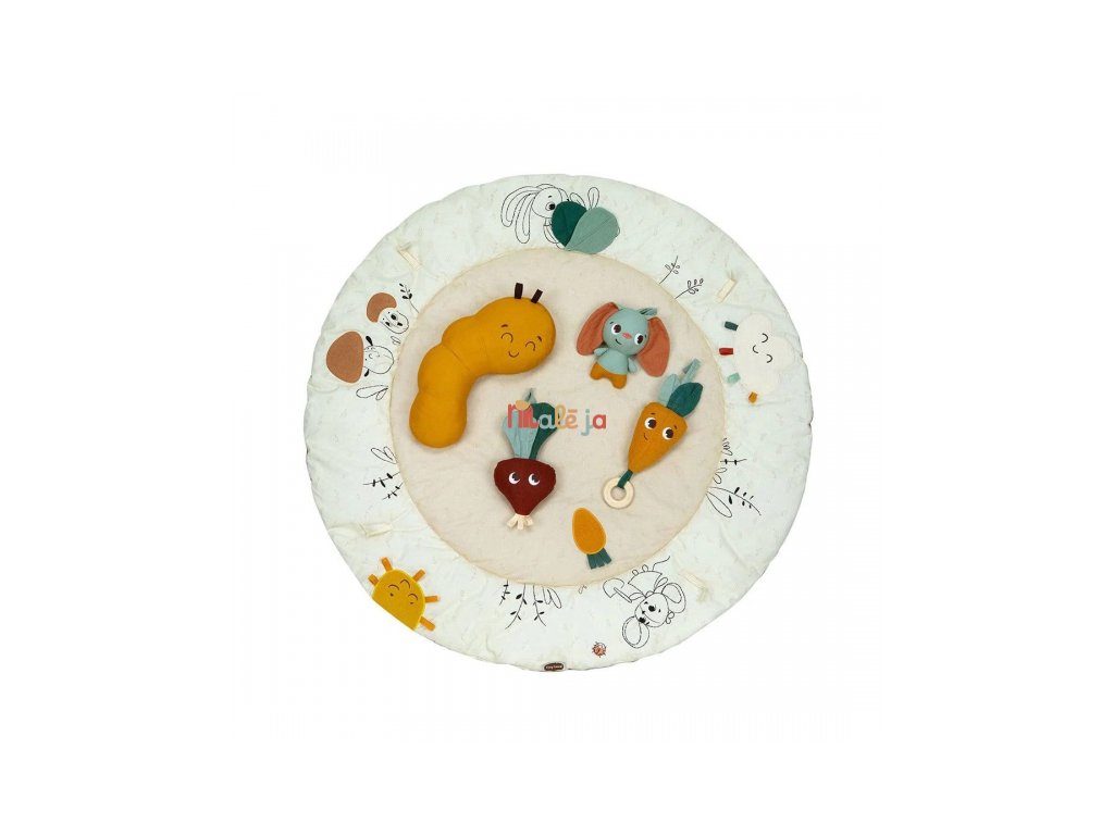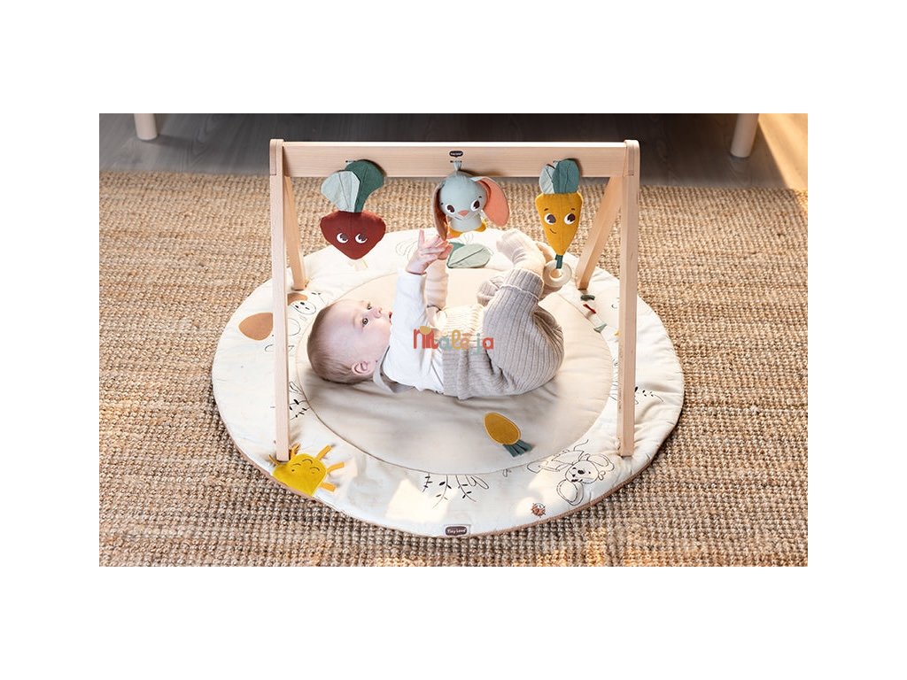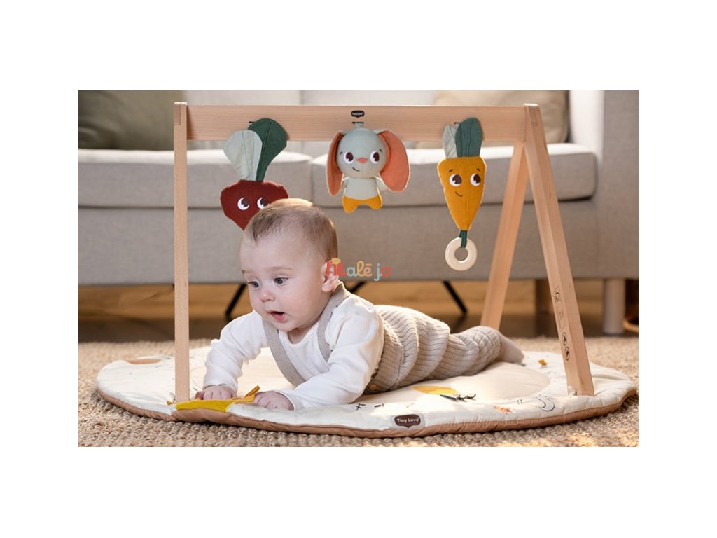 Odnímateľná drevená hrazda umožňuje zavesenie hračiek v podobe chrastiacej repy, rozkošného zajačika a mrkvičky s krúžkom na uchopenie. Priamo na deke nájdete textilné aplikácie s rôznymi textúrami na skúmanie.