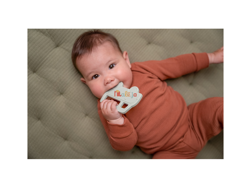 Mäkké silikónové hryzátko s rôznymi textúrami láka dieťa na skúmanie v ústach a pomáha tak pri prerezávaní prvých zúbkov. Hryzátko má tvar pre ľahké uchopenie detskými ručičkami.
