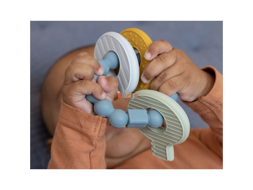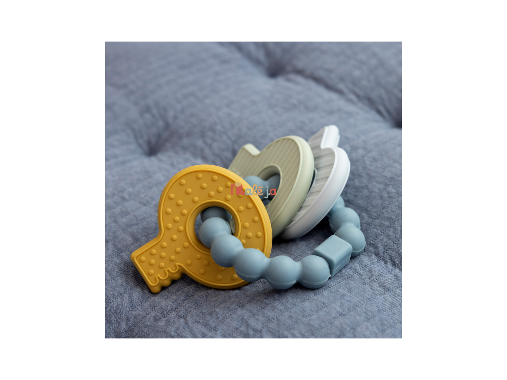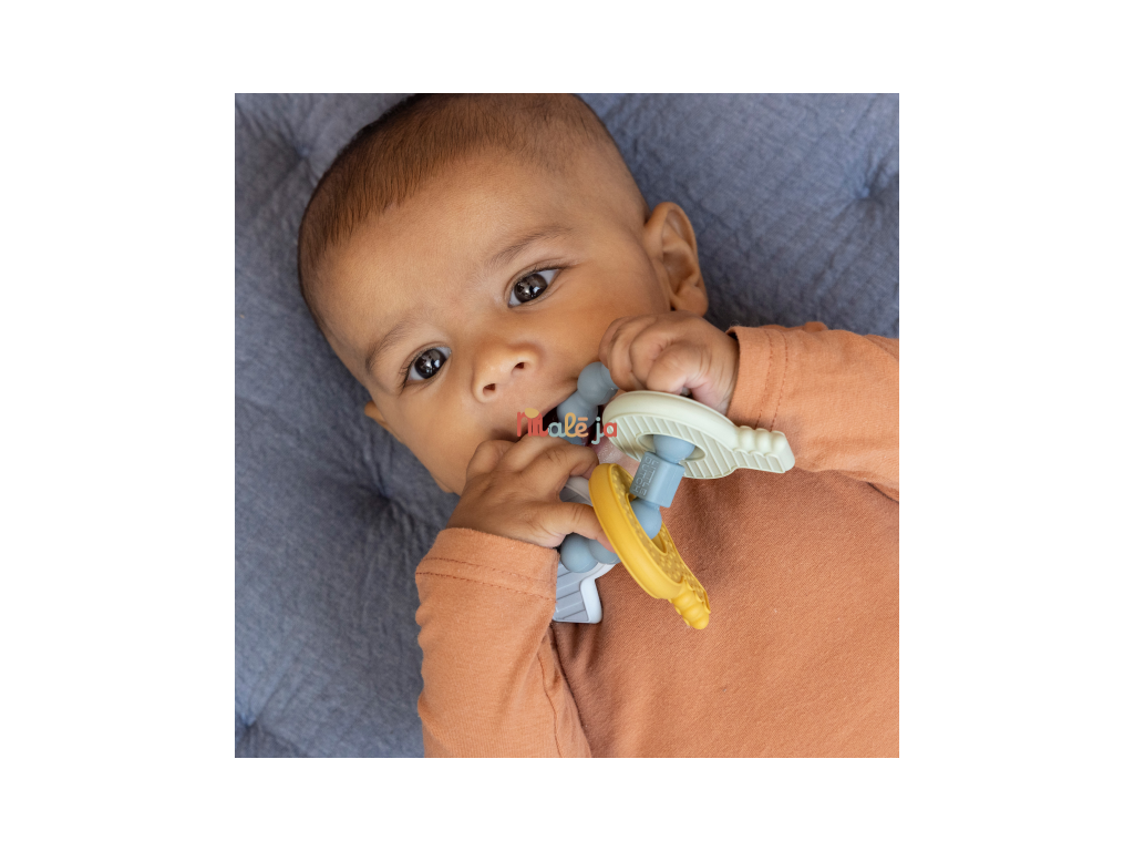 Mäkké silikónové hryzátko s rôznymi textúrami láka dieťa na skúmanie v ústach a pomáha tak pri prerezávaní prvých zúbkov. Hryzátko v podobe kľúčov na krúžku má tvar pre ľahké uchopenie detskými ručičkami. Vhodné pre deti od 4 mesiacov.