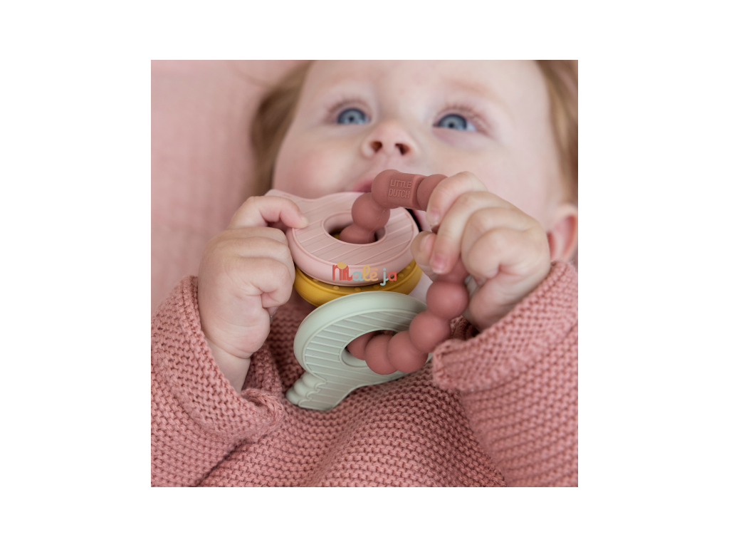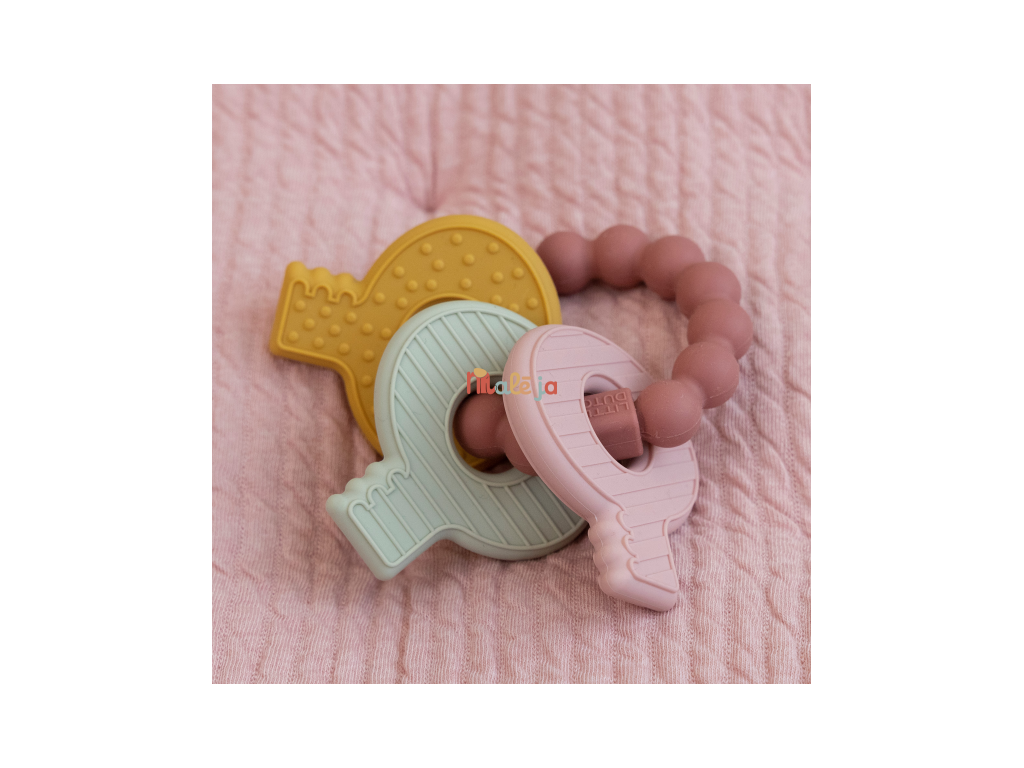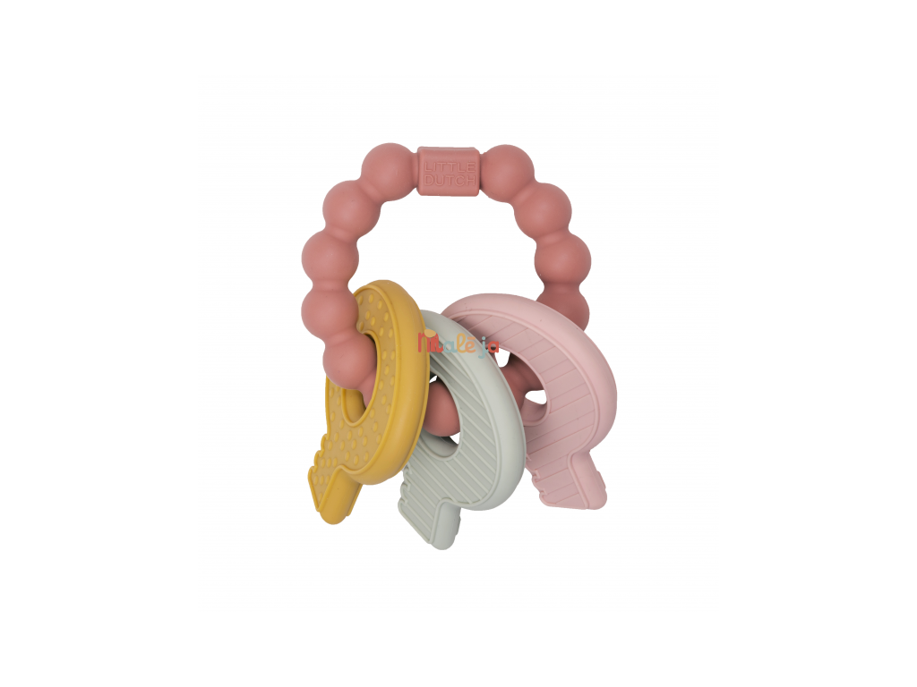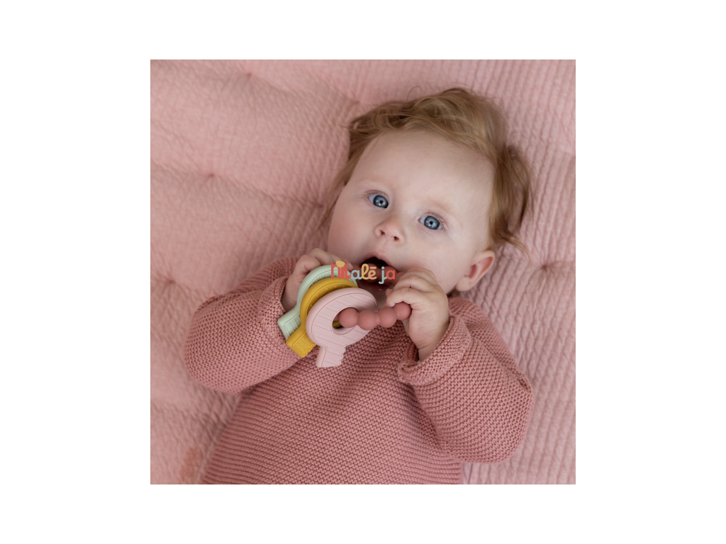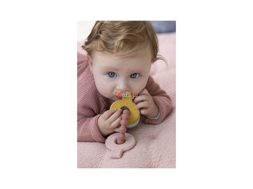 Mäkké silikónové hryzátko s rôznymi textúrami láka dieťa na skúmanie v ústach a pomáha tak pri prerezávaní prvých zúbkov. Hryzátko v podobe kľúčov na krúžku má tvar pre ľahké uchopenie detskými ručičkami.