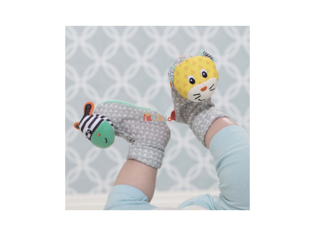 Navliekacie papučky s veselými tvárami tigríka a zebry podnecujú rozvoj sluchu, zraku a hmatu dieťaťa. Dieťa pri kopaní nožičkami monitoruje a skúma pohybujúce sa hrkajúce zvieratká.