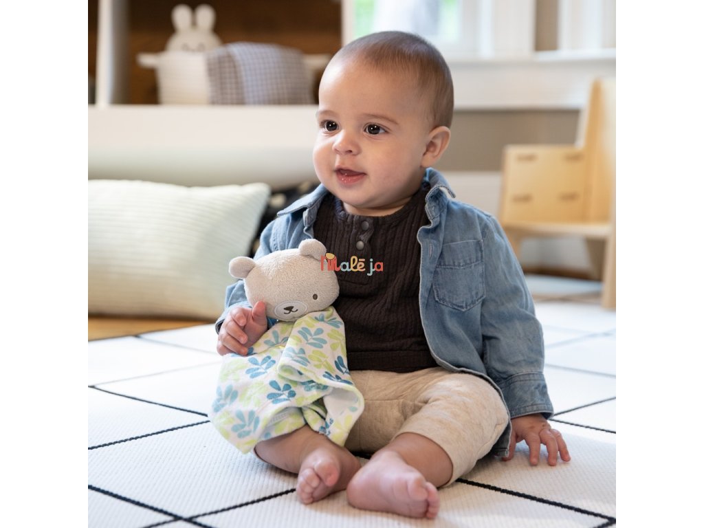 Tento mäkký maznáčik, vyrobený z plyšovej látky, udrží bábätko pokojné. Nielen, že sa táto milá mäkká dečka drží ľahko v malých detských rúčkach, ale je aj príťažlivá na pohľad. S výrazným rastlinným vzorom a na vrchole s mimoriadne roztomilým Medvedíkom Nateom.